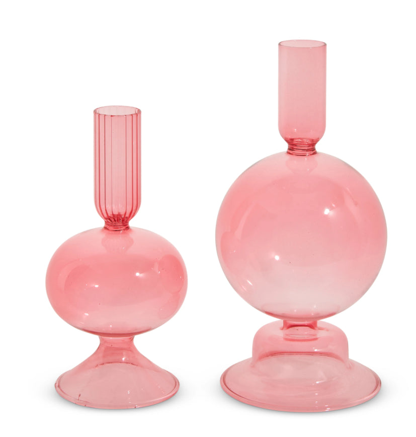 7.25" Green and pink Candle Holder features a sleek, vibrant green finish with a simple yet elegant design. Perfect for adding a pop of color and style to any tabletop or mantle for a cozy, inviting atmosphere.