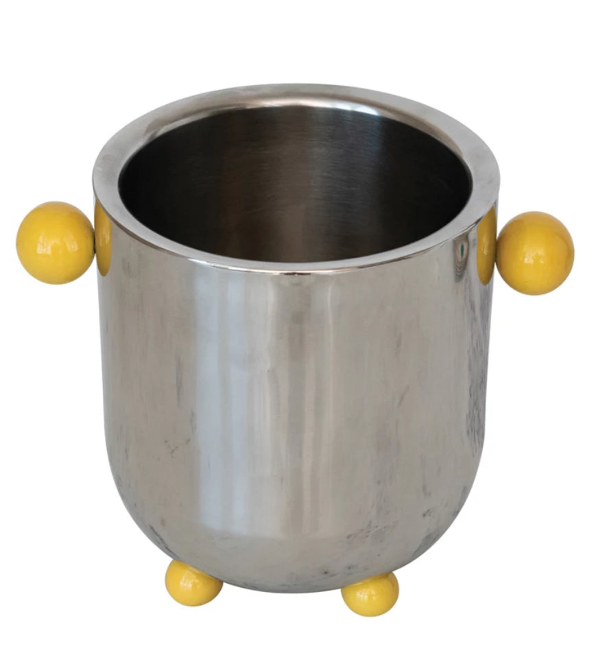 7" Round x 8-1/4"H 2 Quart Stainless Steel Double-Walled Ice Bucket w/ Citron Color Enameled Ball Handles & Feet