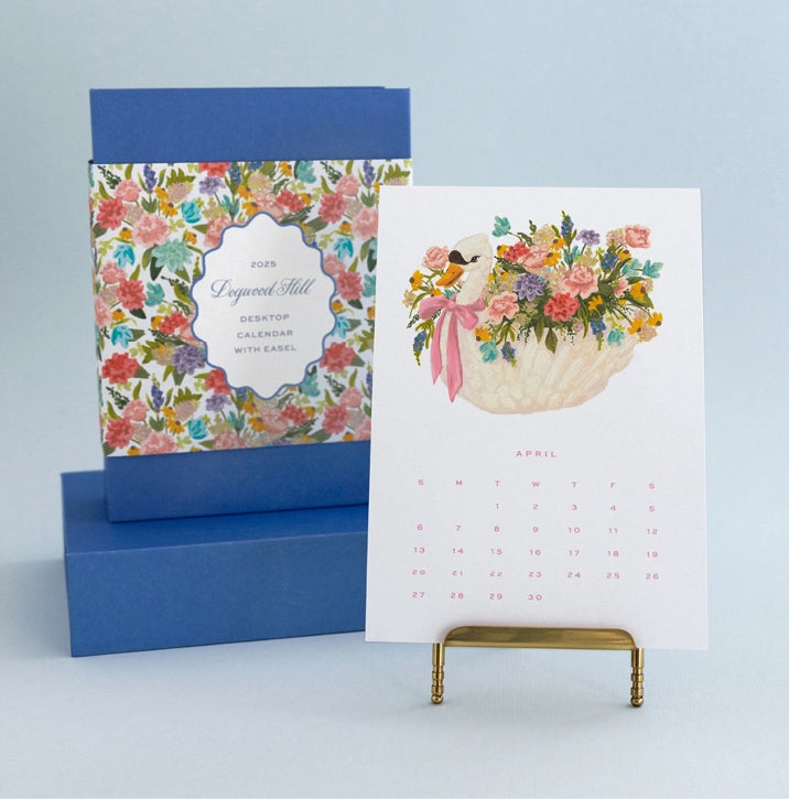 Set of 13 cards sized 5x7 inches + Artisanal Easel with a Gold Finish. Packaged in a Custom Box. Artist Name: Multiple Artists Our Desktop Calendar features original artwork created specifically for each month from twelve Dogwood Hill artists. Packaged in a Custom Keepsake Box or Envelope featuring art by Casey Snipes. The insert that holds the easel may be removed so that the box can be used beyond the calendar year.