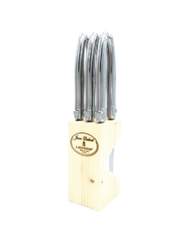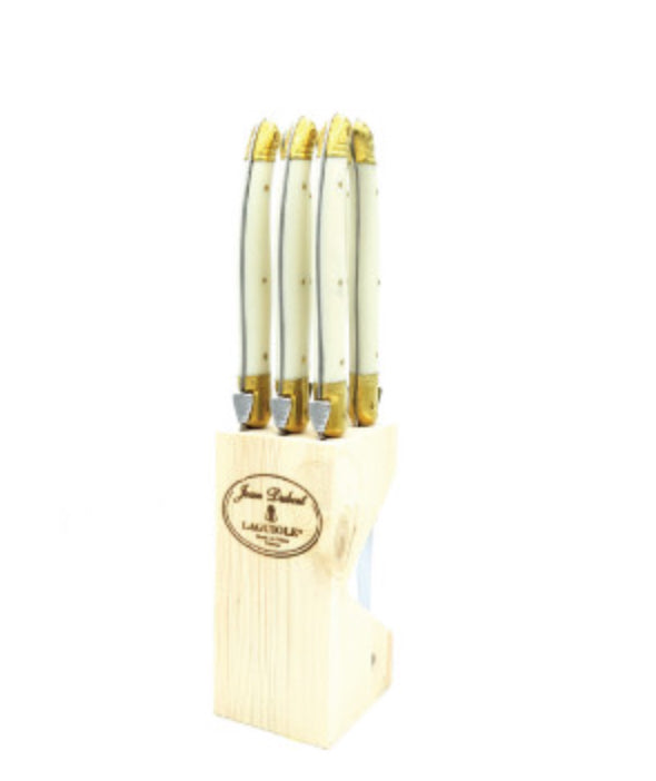 This set of steak knives have ivory or stainless handles to help create a classy look that works for any type of occasion. Also included in this set is a wooden knife block, which will safely store your knives inbetween uses. Each knife in this set has a gauge of 1.2mm, and is put through 25 different production stages before it is stamped, polished, and packaged. The knives are rust resistant and are dishwasher safe. These knives have a serrated blade.