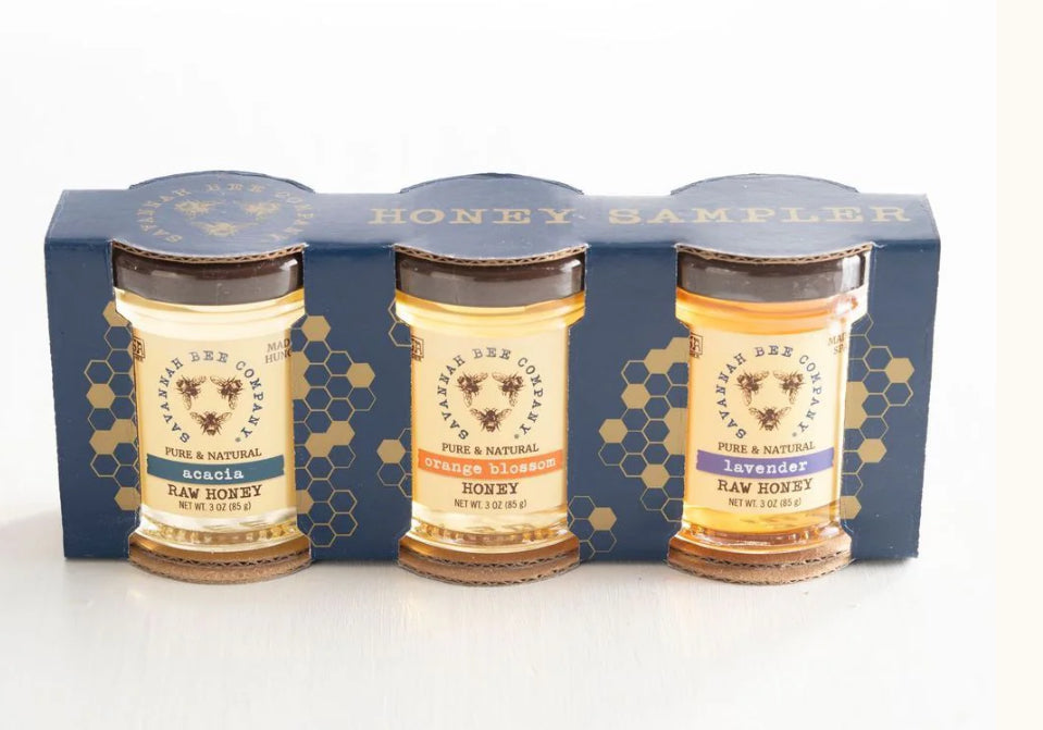 Includes 3 oz honey samples of Acacia Honey, Orange Blossom Honey, and Lavender Honey.