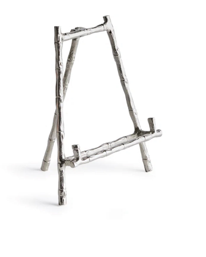 Made to hold platters, cookbooks or a small piece of art, this easel is strong and sturdy. The silver bamboo-like details add a traditional aesthetic.