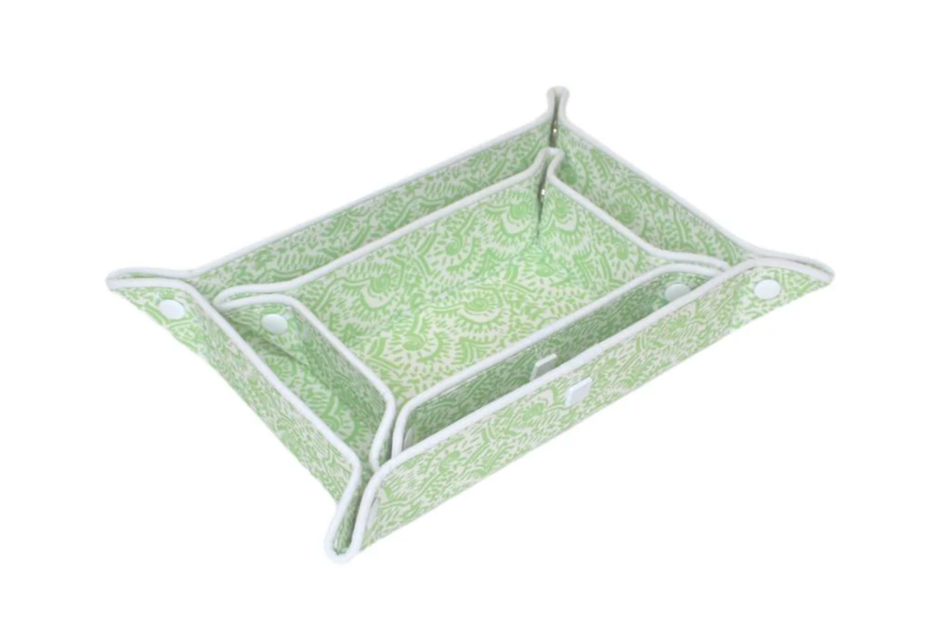 Stay organized with our Trays, designed to catch all your pocket-sized items for home, office or TRVL. Designed in our batik print, the four corners can be unsnapped to easily fit in luggage and placed on a hotel nightstand, to ensure no valuables are left behind. Makes for a great gift!