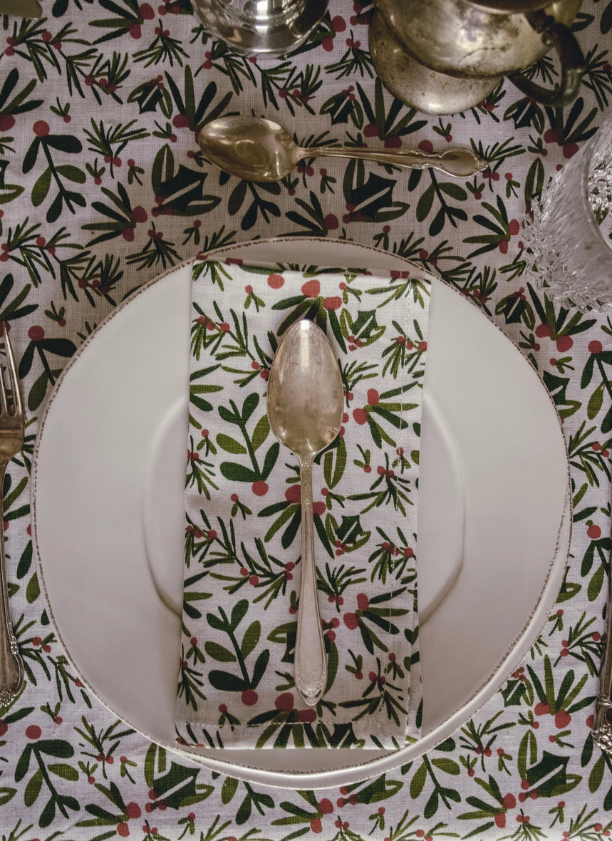Our classic linen tablecloth featuring a festive, hand-illustrated Holly Berry pattern. This linen tablecloth makes the perfect Christmas table for the holiday season and effortlessly layers with other prints and solids. 60x90". The newest addition to our table top collection, this 100% linen tablecloth will add an elevated touch to the table, part of our collaboration with our friends at Bauble Stockings. Layer this tablecloth with the matching napkins + runner, or mix + match with other patterns + solids to create a beautiful tablescape for any occasion. Makes for a beautiful Christmas or holiday table.