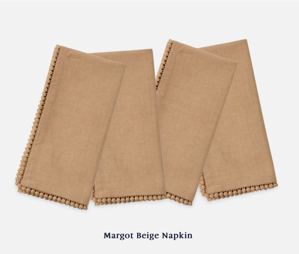 Our Margot napkins add feminine flair to any party. Make luncheons lovelier and cocktail hours cooler with the pom pom border of this cotton canvas collection.