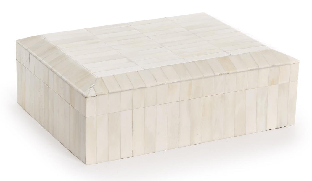 Enhance your space with the timeless elegance of this exquisite 9" x 12" beveled covered box. Crafted from hand made polished bone tiles, this covered box exudes sophistication and charm. Handmade with precision, it is the perfect addition to your home decor. Whether gracing a coffee table or adorning a vanity, its versatility knows no bounds.
