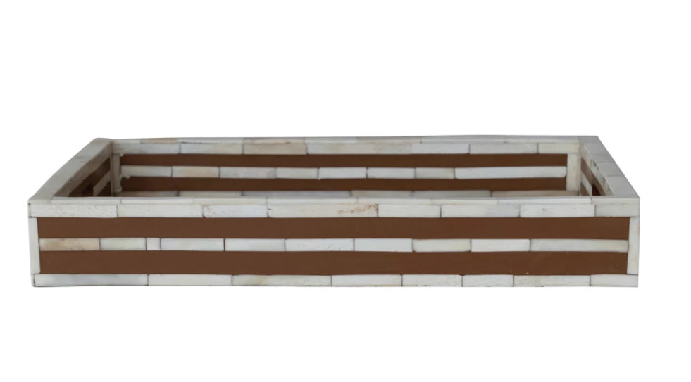 18"L x 12-1/2"W x 2-3/4"H Bone & Resin Inlaid Tray w/ Handles, Brown & Cream Color (Each One Will Vary)