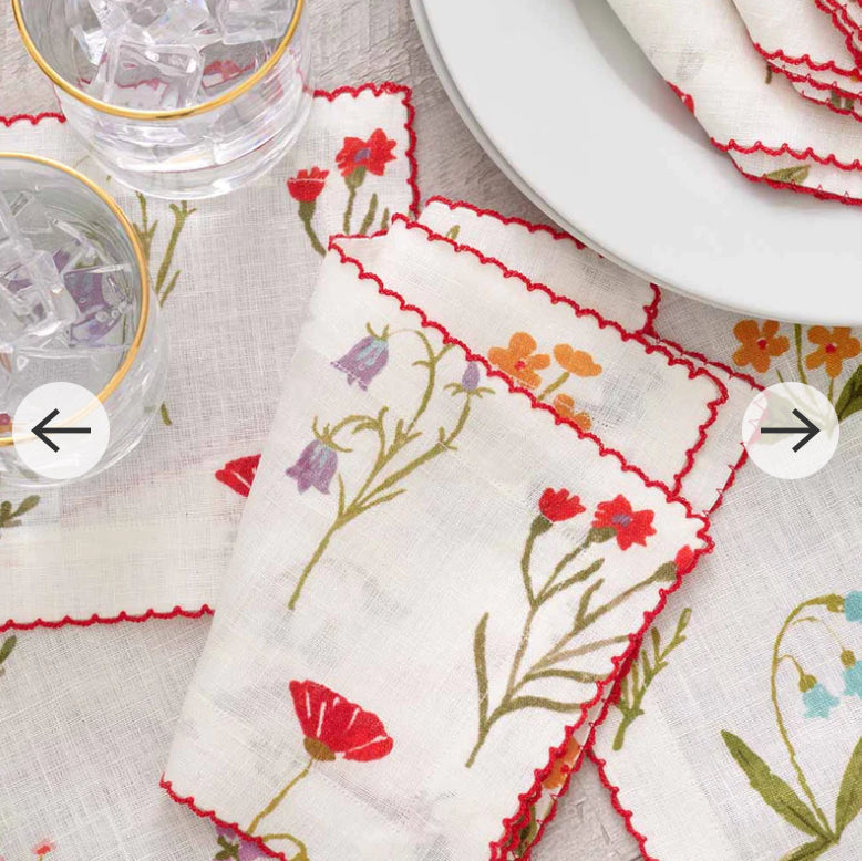 As fresh as an organic cutting garden, our Botanical Garden print is crisp and distinctive, with fresh red poppy flowers, miniature yellow daffodils and lavender bluebells floating on a soft white linen base. Edged with a red scalloped stitch, this exclusive printed design is seasonless; perfect for everyday and elevated entertaining.