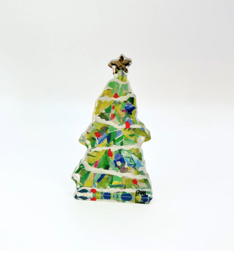 Our Christmas tree collection is growing! Our bright green adorned bitty tree is a merry addition to any Christmas decor and pairs well with our other bitty trees, the red adorned tree as well as the festive green bitty tree. This free standing acrylic tree features Lauren's collage work printed onto 1/2" thick acrylic.