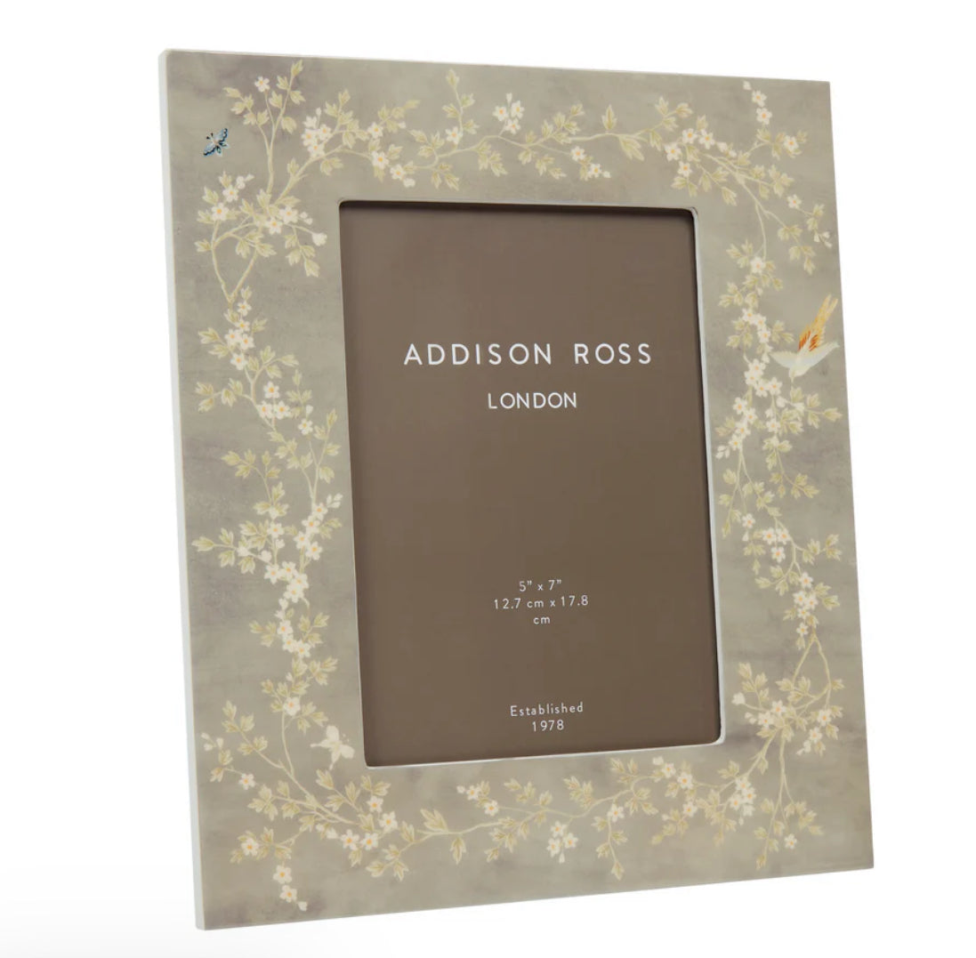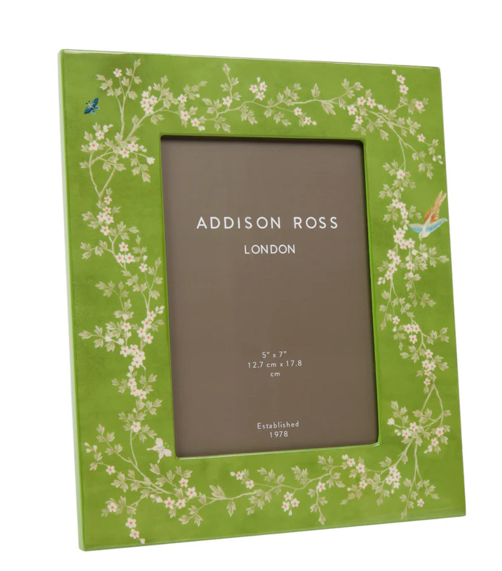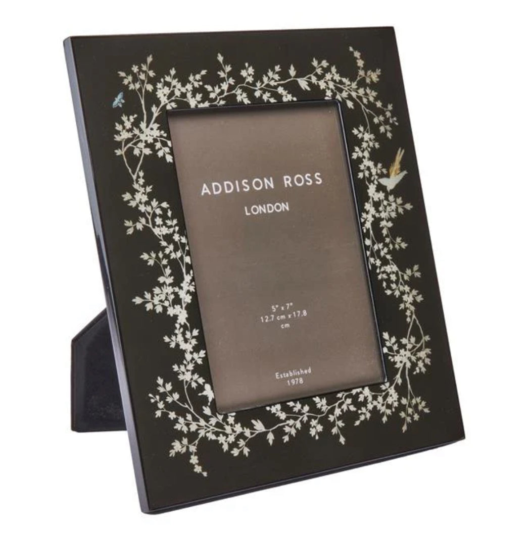 This 5x7 in. Chinoiserie blossom photo frame was exclusively designed by Sarah David Ross, finished with 20 coats of high glass lacquer, hand polished between each coat. This frame is able to stand both landscape portrait and features a black velvet backstand.