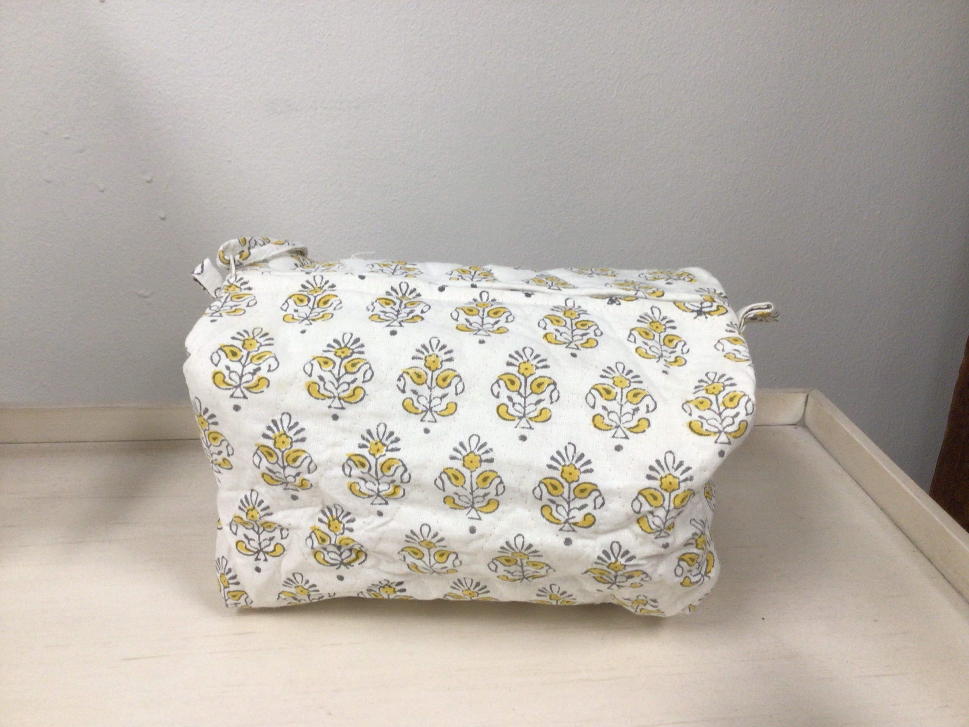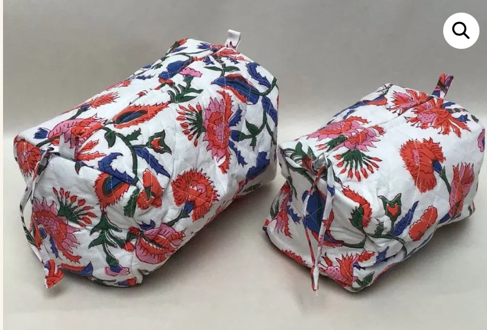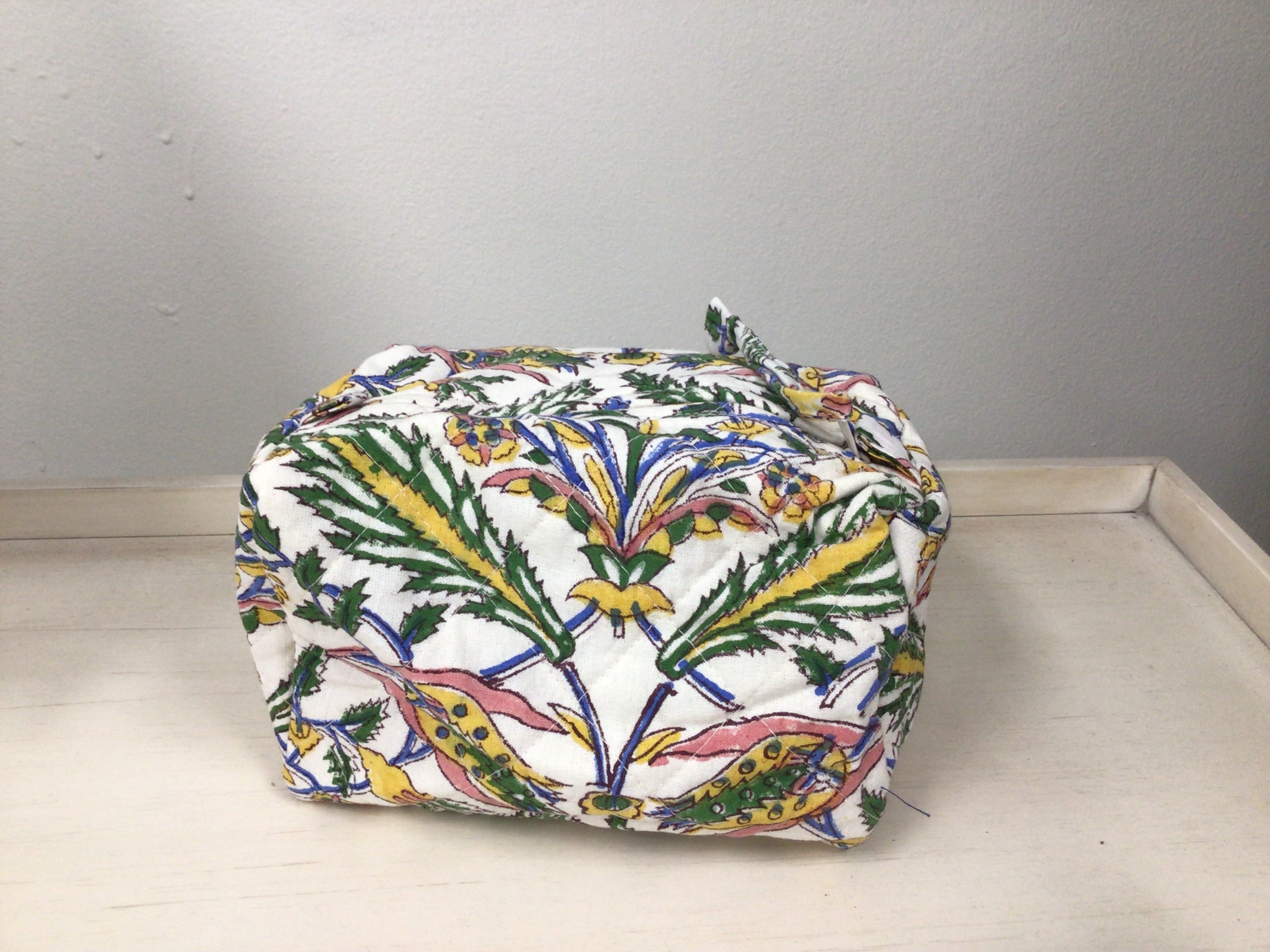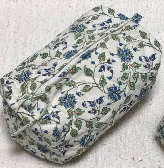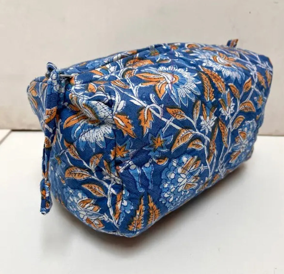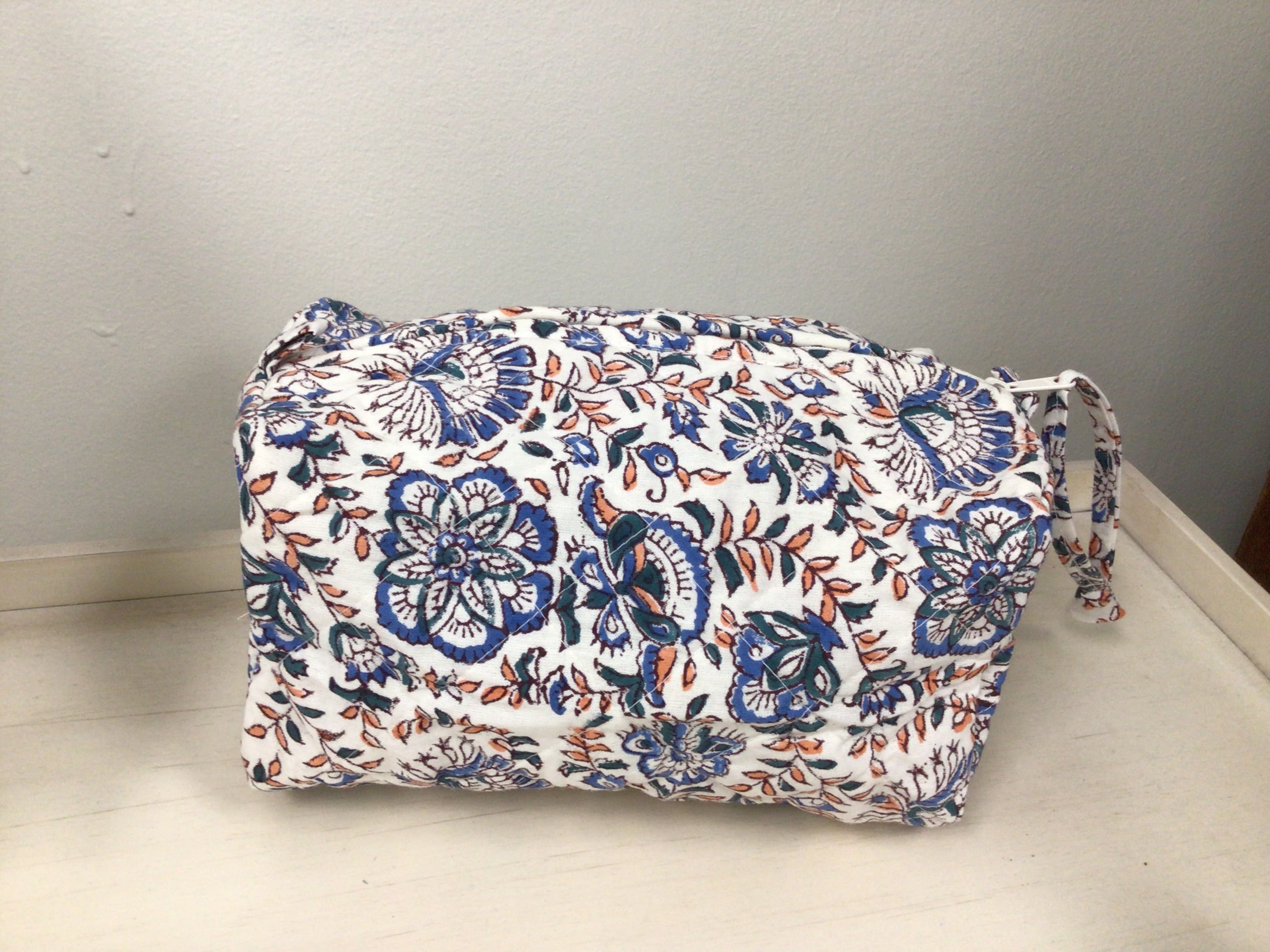 Handblock printed cosmetic bags. Plastic lined. Zip closure.