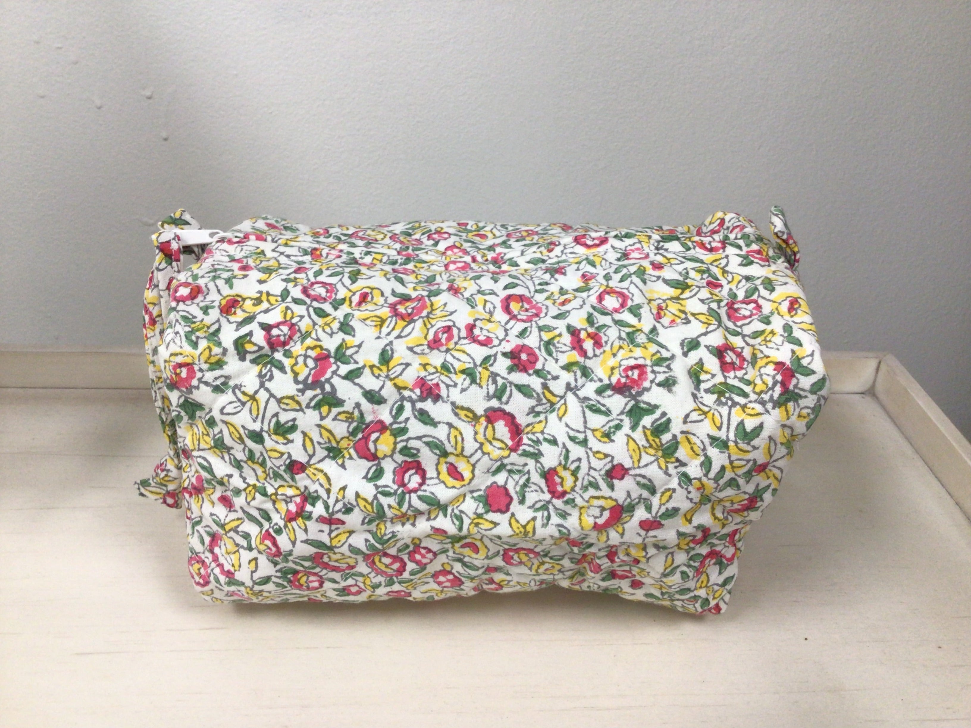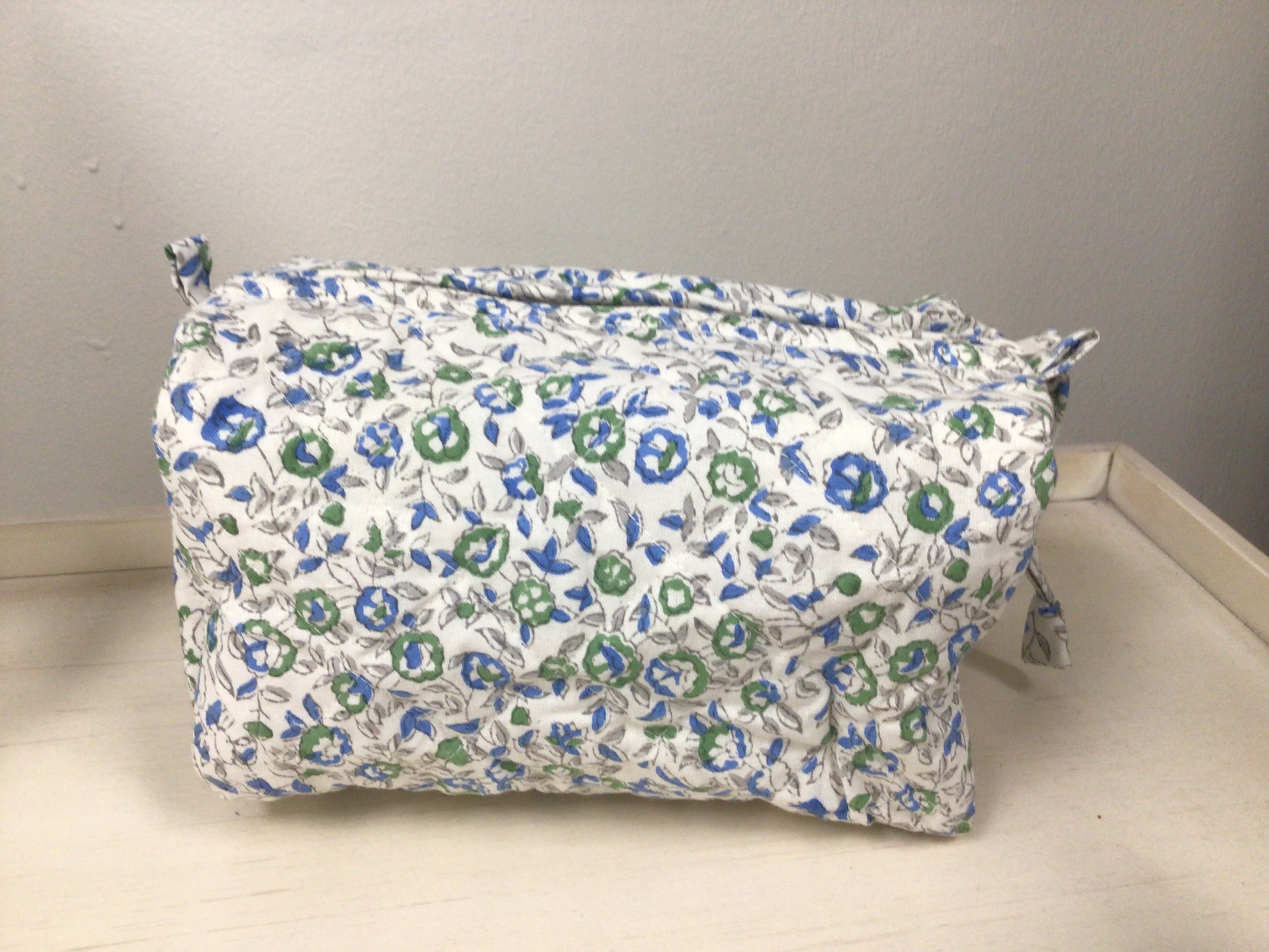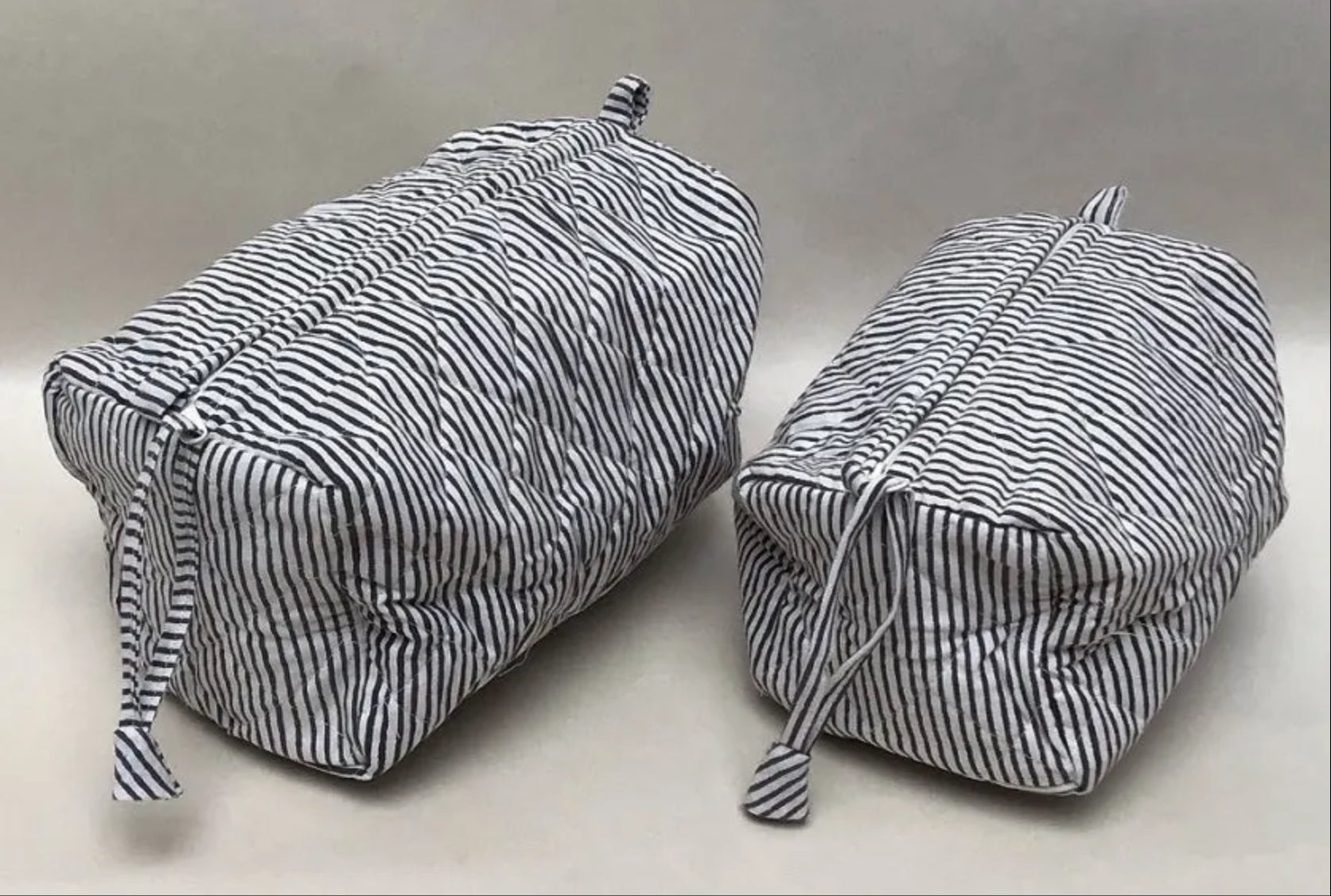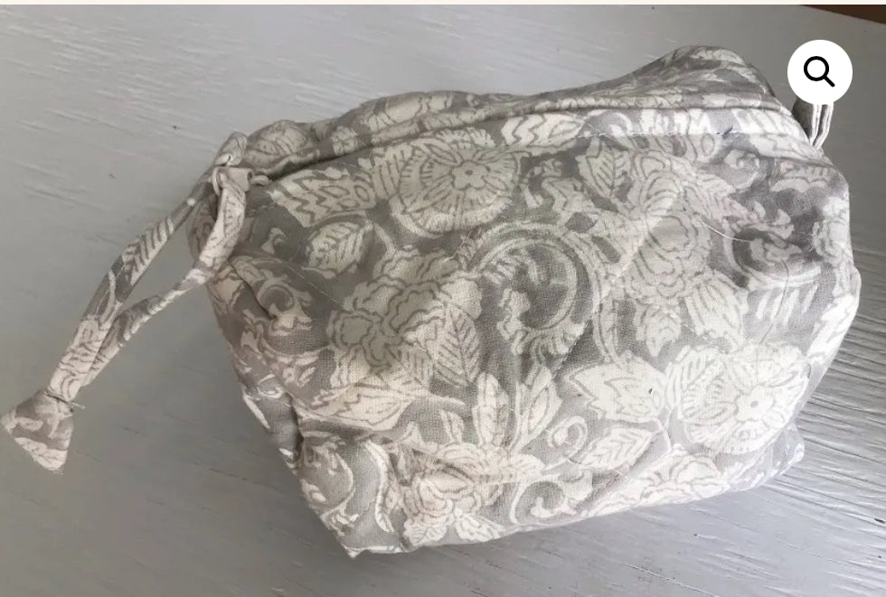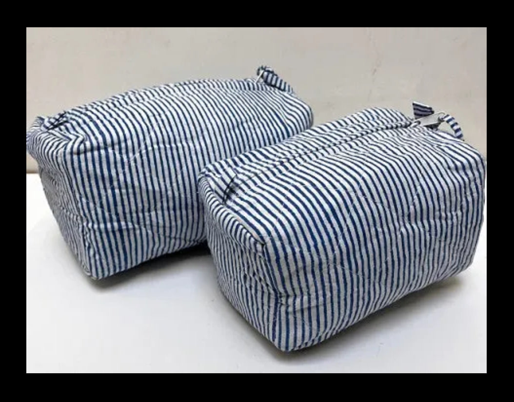 Handblock printed cosmetic bags. Plastic lined. Zip closure.