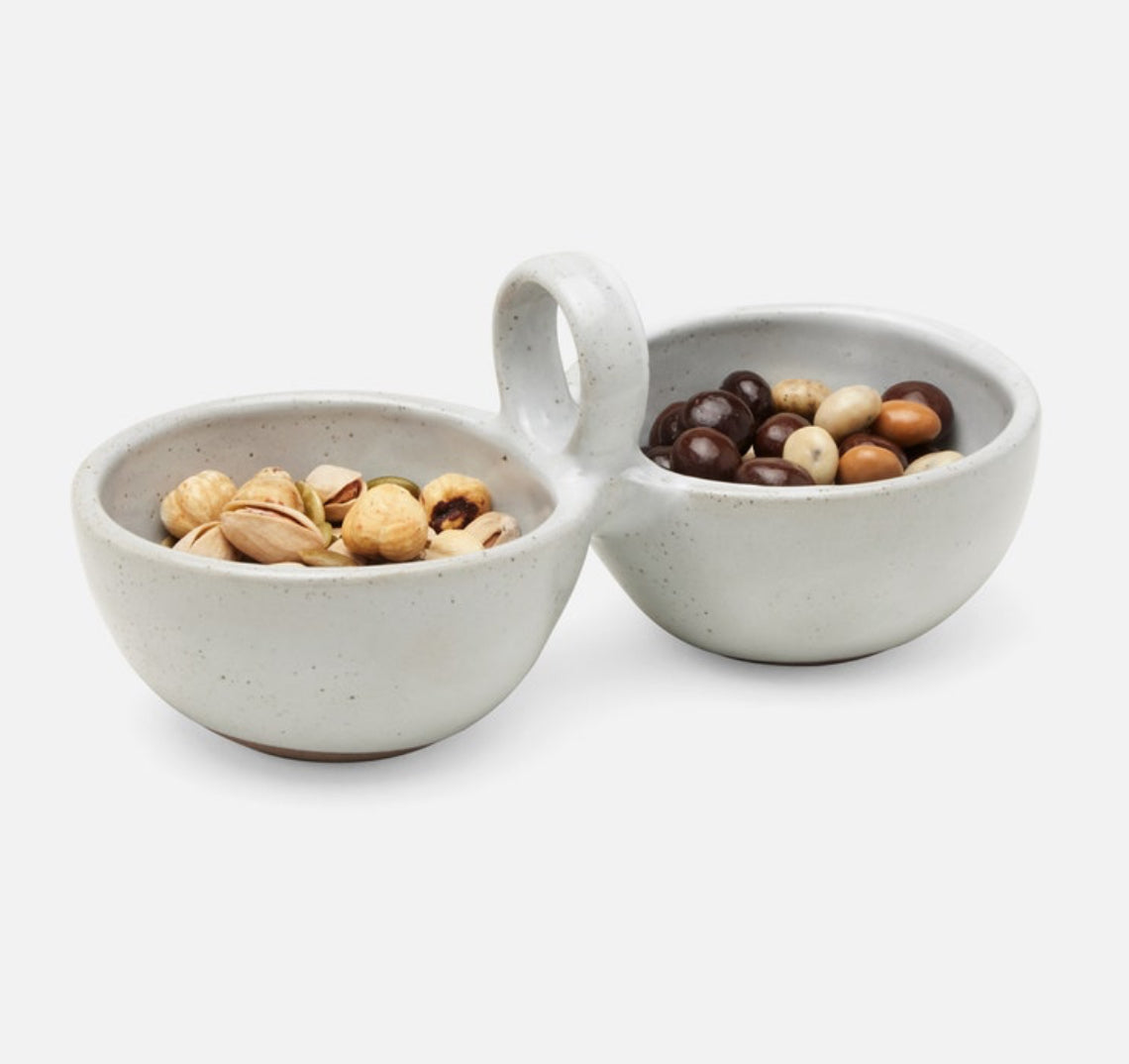 Our Desmond nut dishes pair sleek stoneware with ingenious design: a small ring hovering above either double or triple bowl design for easy carrying from room to room. Available in a new finish.