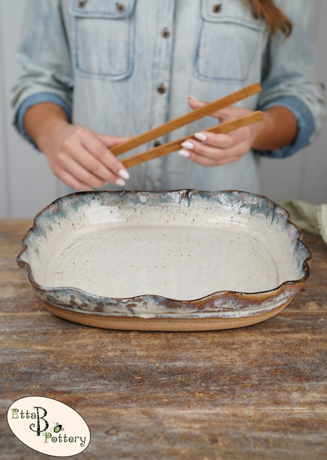 Large square ruffled dish, perfect for a fruit cobbler, baked dip or meal. Approx 14"