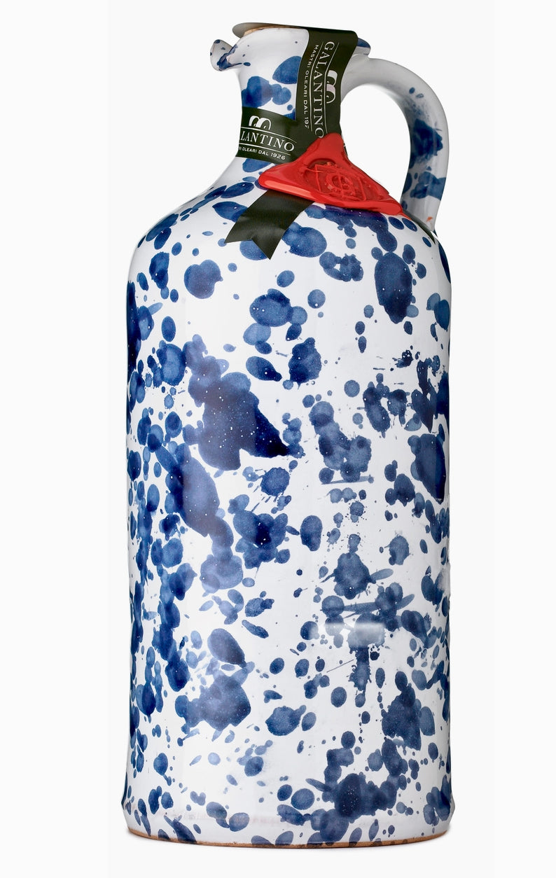 The “Fantasia" ceramic bottle comes in a variety of colors and patterns and is hand-painted by local artisans of the Puglia region of Italy, where the award-winning Frantoio Galantino olive mill is located. It is filled with their delicious and authentic extra virgin olive oil made from Ogliarola and Coratina olives. Golden yellow-green in color and well balanced flavors of almond and artichoke make this an ideal extra virgin olive oil for everyday use. Great for cooking and for dressing a salad. Discover the passion of the Galantino family, masters of extra virgin olive oil since 1926. They only select the best olives from their groves near Bari, in Puglia, a region that produces more olives than anywhere else in the world. Through cold extraction and strict quality testing, Galantino ensures that their extra virgin olive oil is consistently the best. Net weight: 500 ml/17 fl oz