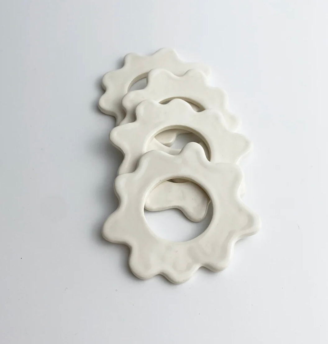 Hand made ceramic napkin rings. The curvy shape brings a subtle, stylish touch to your everyday tablescape, while the creamy white color pairs well with any napkins. All ceramic napkin rings are formed and glazed by hand.