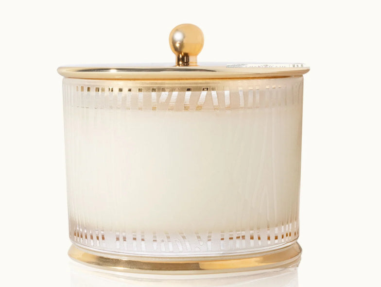 Accented with a glistening gold lid and gilded gold base, this elegant and luminous frosted wood grain candle is the perfect way to experience Frasier Fir.