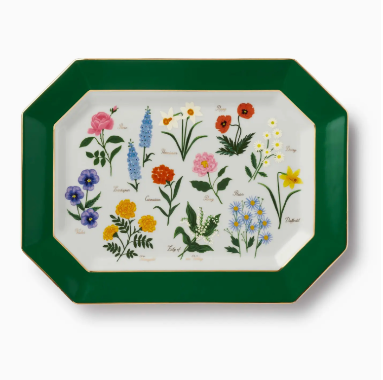 Serve hors d'oeuvres or family-style dishes on this elegant porcelain tray, featuring a collection of Garden Study illustrations, metallic gold accents, and a gold-painted edge. πππππ’π₯π¬ β’ Porcelain β’ Hand wash. Not microwave safe. β’ Full-color illustration with metallic gold accents and gold painted edges β’ 15" W x 11.25" L
