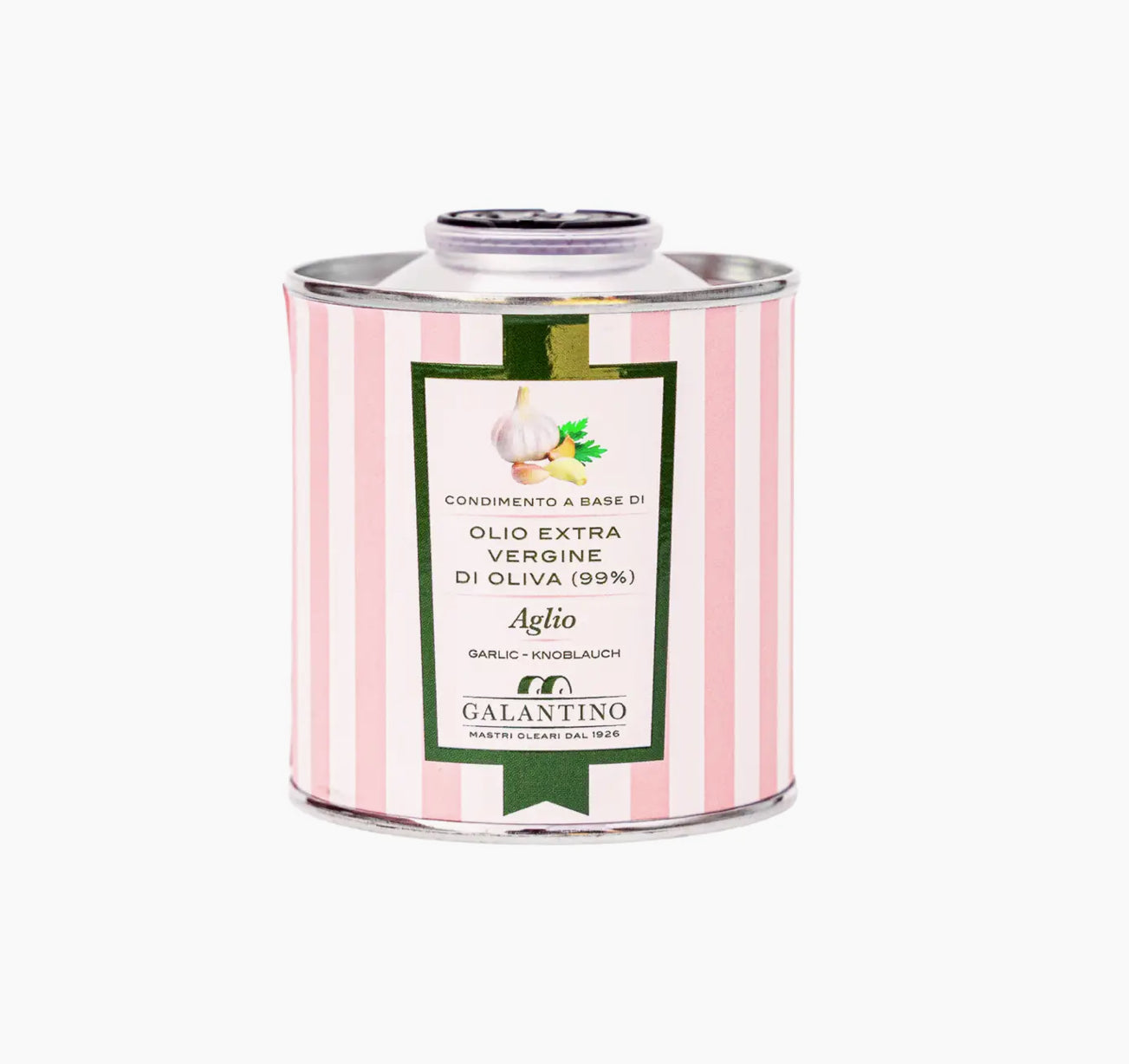 This delicious, garlic fused extra virgin olive oil is part of Galantino’s line of flavored oils. Using an ancient technique revived by Galantino in the 1990s, this fused oil is produced by crushing together the olives and fresh garlic, without the use of any added essences. The result is an intense, bright and savory flavor, recommended for flavoring soups, bruschetta, meat, vegetables and for spaghetti. Discover the passion of the Galantino family, masters of extra virgin olive oil since 1926. They only select the best olives from their groves near Bari, in Puglia, a region that produces more olives than anywhere else in the world. Through cold extraction and strict quality testing, Galantino ensures that their extra virgin olive oil is consistently the best. Net weight: 100 ml/3.38 oz