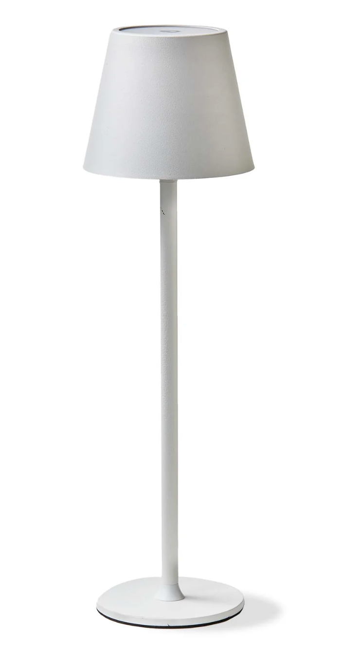 This stylish table lamp features a sleek white steel body and a touch-sensitive base that allows for easy on/off control and dimming. the built-in rechargeable battery provides approximately 6 hours of cordless illumination on a full charge, and can be easily recharged in 4 hours via a usb cable (included). perfect for a desk, nightstand, or anywhere you need a touch of modern lighting.
