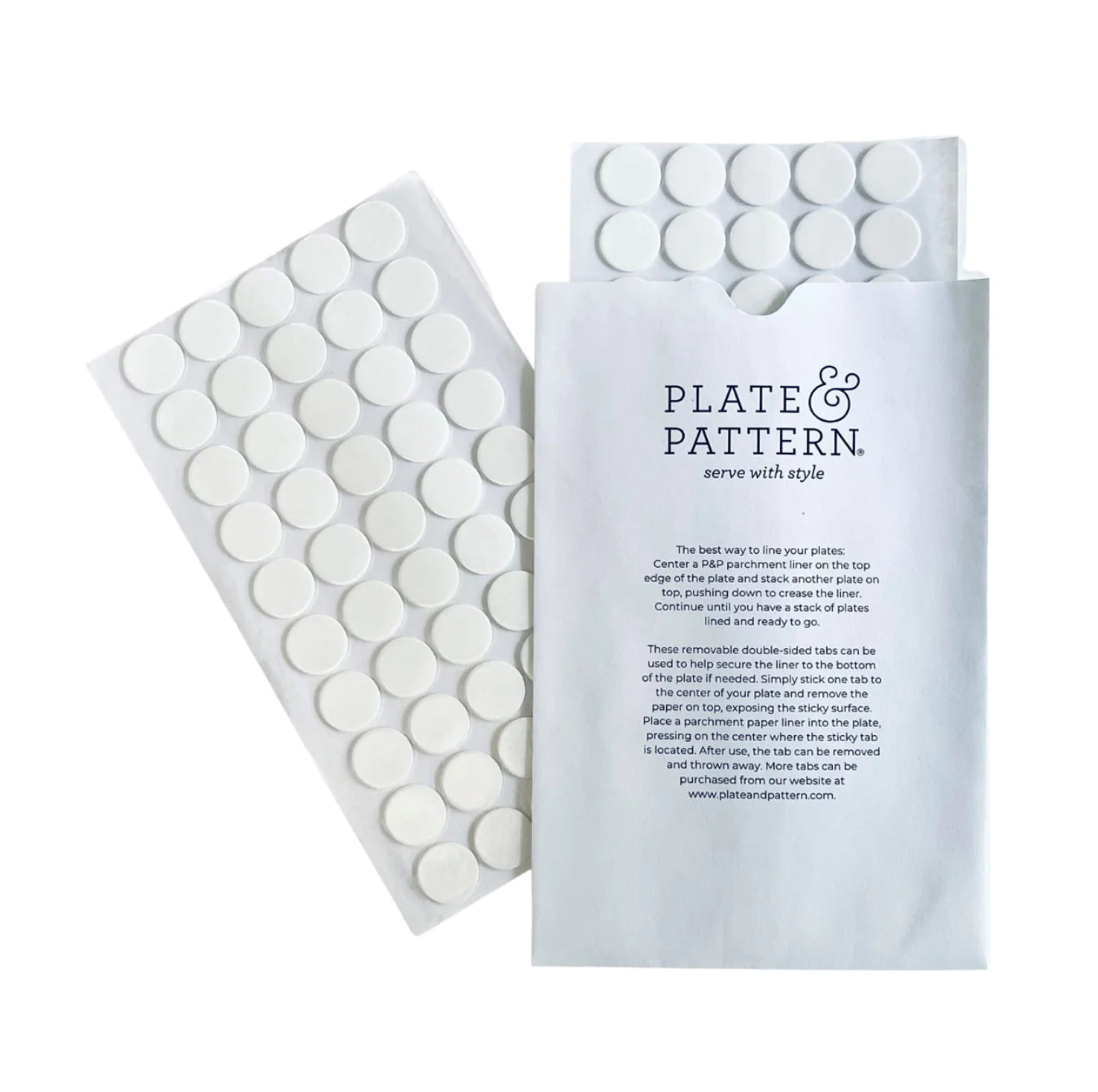 These removable double-sided tabs can be used to help secure liners to the bottom of our metal and white metal plates when needed. We love to use them when setting a table in windy conditions or for added security.