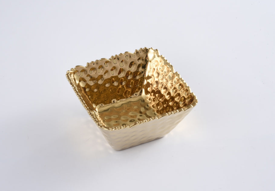 Square Snack Bowl in Golden Millennium. Great for individual snacking, dips or for toppings for a make your own taco, sundae, or pizza night! A perfect addition to any bar for lemons and limes. Striking and elegant golden titanium finished high-fired porcelain. Food safe, tarnish free, dishwasher safe, oven safe to 500°. Tarnish and stain-free. Easy Care.