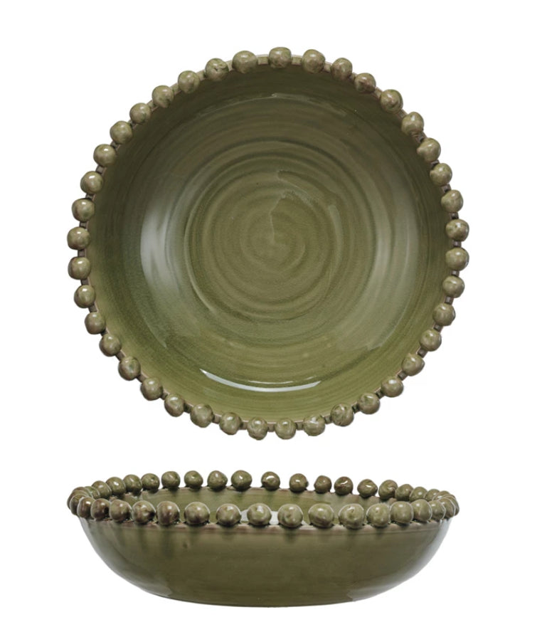 16-1/2" Round x 4-1/4"H Decorative Handmade Terra-cotta Bowl w/ Hobnail Edge, Reactive Glaze, Green (Each One Will Vary)