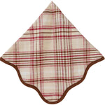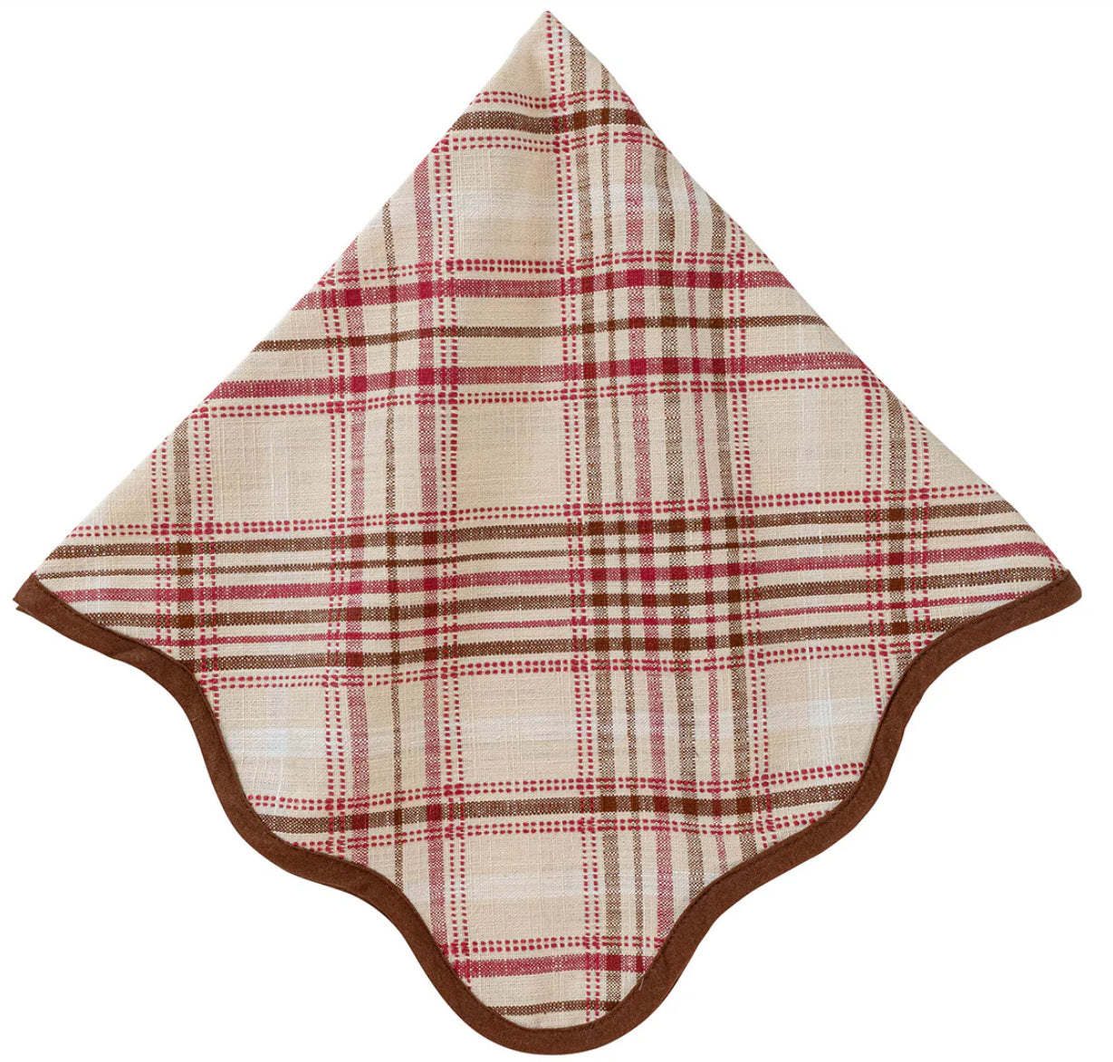 Inspired by the rich hues of harvest season, woven cotton in mulberry, chocolate, and cream is elegantly tailored on the bias and trimmed with a sumptuous, scalloped edge, to transform your table for autumn gatherings and Thanksgiving feasts.