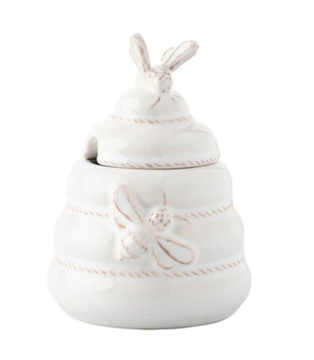 From breakfast to tea time, this beautifully sculpted ceramic hive gives a home to your favorite honey/jam - with a lid and wooden spoon for serving.
