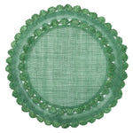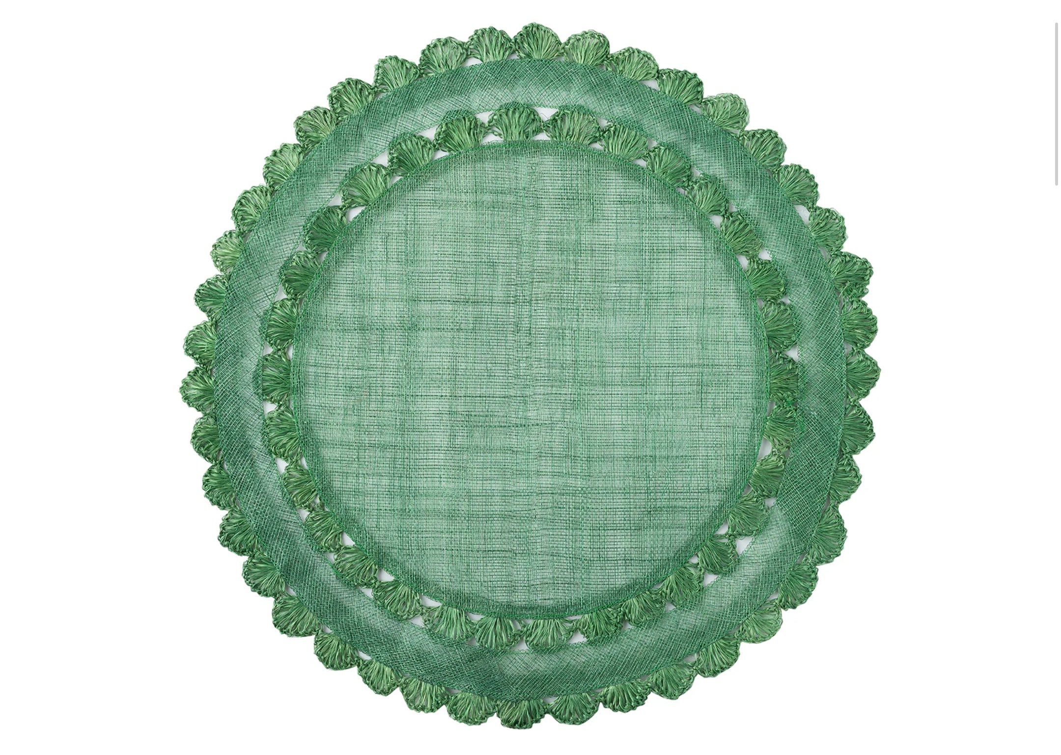 Natural fibers are woven in a rich green hue and embellished by a ruffled trim to create a frame for table settings that is both relaxed and elegant.