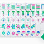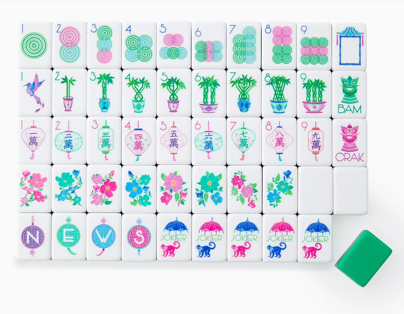 Inspired by the beauty of the great outdoors, the Jasmine Tiles bring a refreshing and vibrant touch to your mahjong game. Featuring a harmonious blend of kelly green, muted lime, and deep blue, this nature-inspired colorway captures the essence of lush gardens, rolling meadows, and tranquil waters. Whether you're playing under twinkling patio lights or gathered around the table with friends, the Jasmine Tiles infuse every game with a breath of fresh air and timeless elegance.