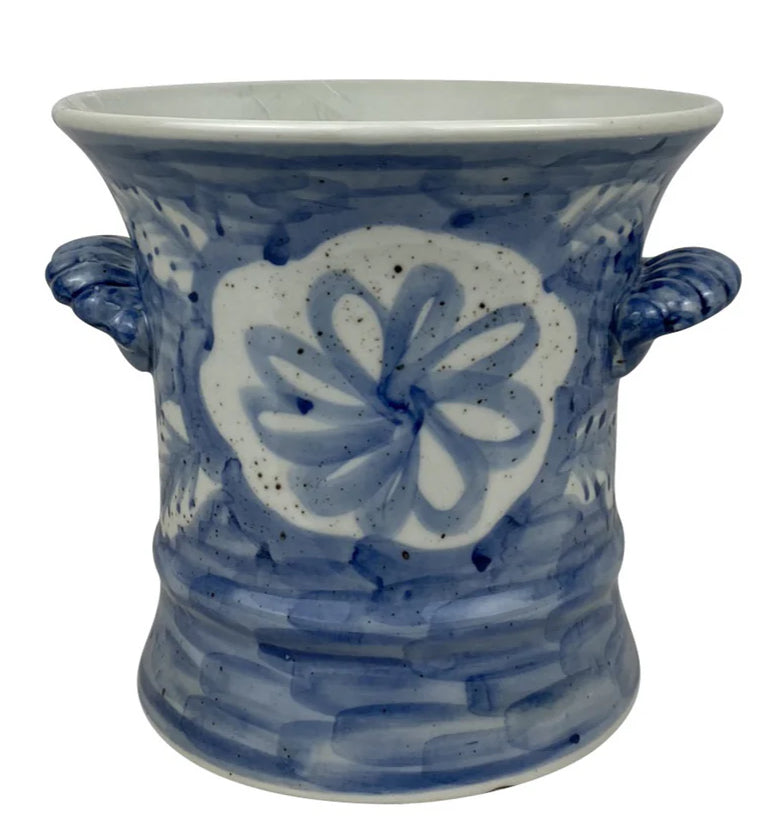 Featuring airy, navy paint swashes that depict water and florals, the Jingdezhen Hand-Painted Porcelain Folk Pot provides a light-hearted view of nature that is an antique reproduction. The porcelain pot is wide-mouthed with small, decorative handles, making it great for a small bouquet or as an accent. It is crafted in Jingdezhen, China - a world-renowned region for high-quality ceramics.