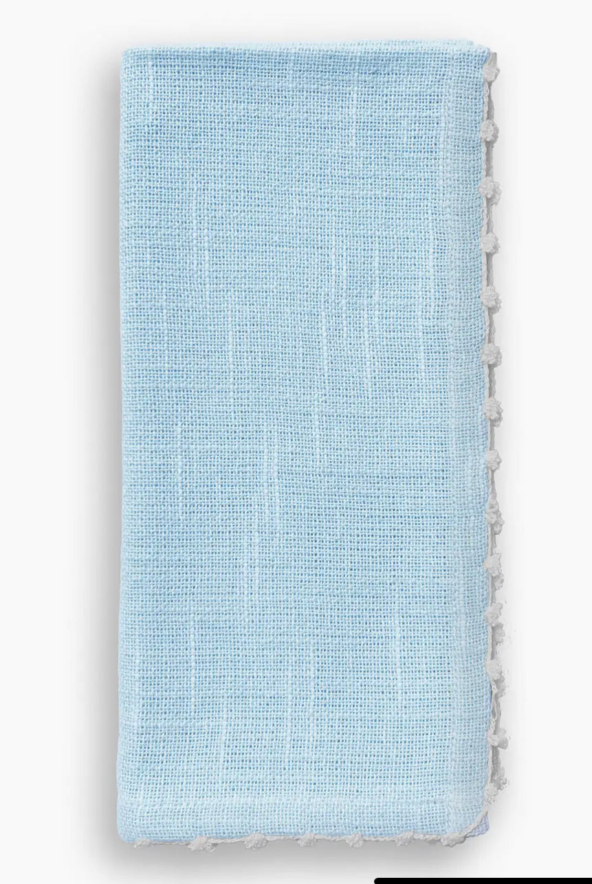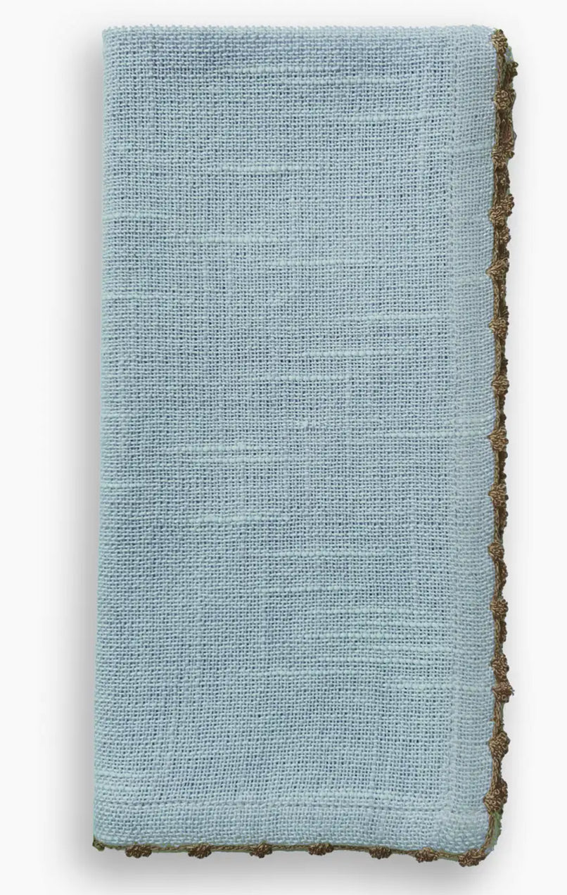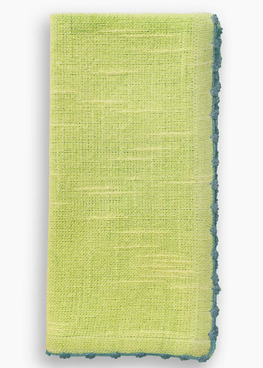 Our Knotted Edge Napkin is made from 100% cotton woven chambray. Adorned with an elegant trim and available in a range of vibrant colors, it pairs perfectly with our coordinating terracotta bead napkin rings. Transform your table into a work of art with this joyful napkin. Dye lots can vary, colors may slightly vary between batches due to the dying process Dimensions are approximately 20" x 20" Care: machine wash, tumble low heat or line dry