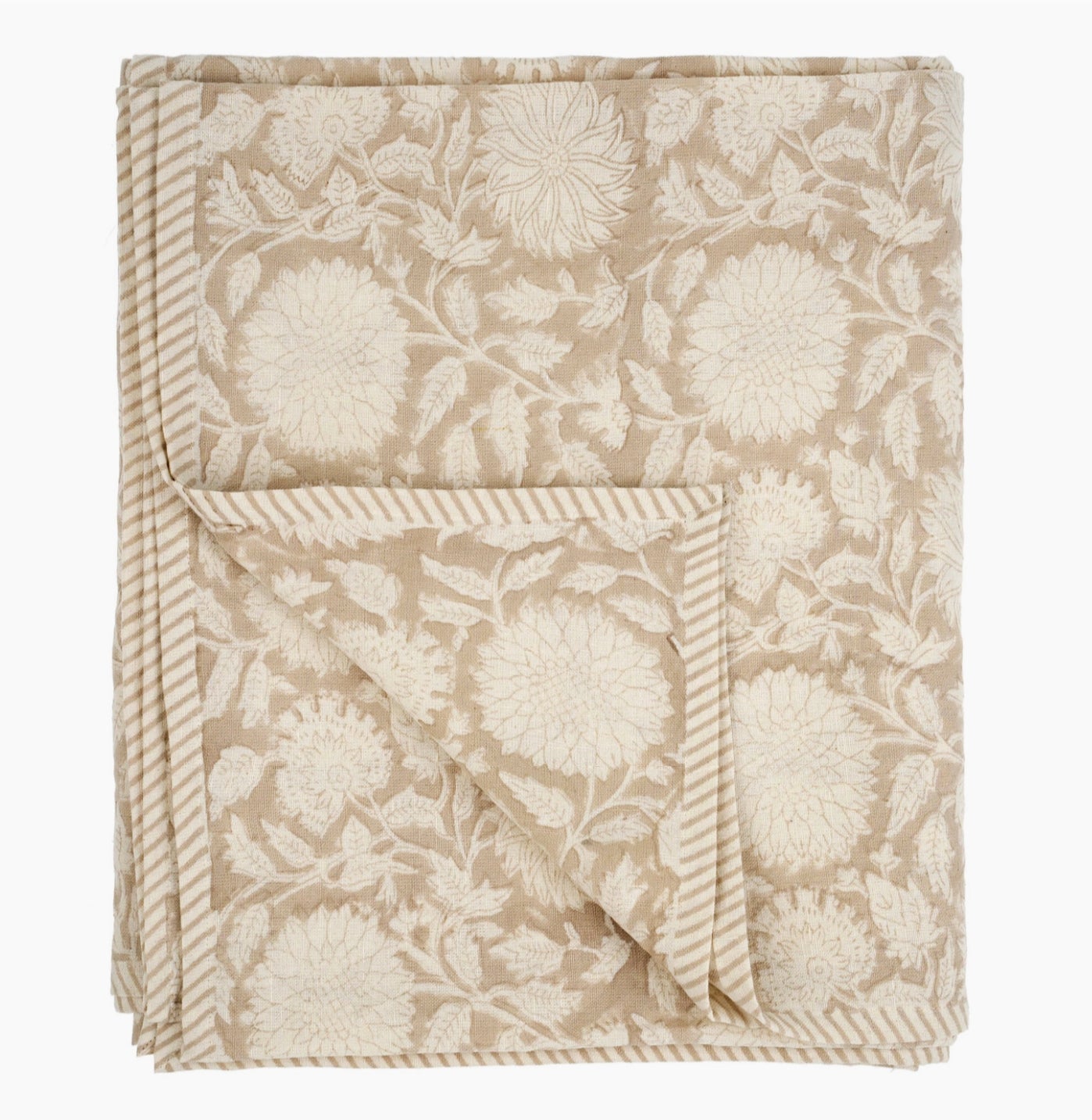 Featuring a fresh coastal inspired block printed design with soft-toned florals, the Maeve Block Print Tablecloth is made with a touchable, ultra-soft linen/cotton blend, and is accented with a playful striped pattern edge. Generous in size, it can accommodate the largest of family farmhouse tables or multitask as a bed spread when draped over a king size bed. Machine Washable.
