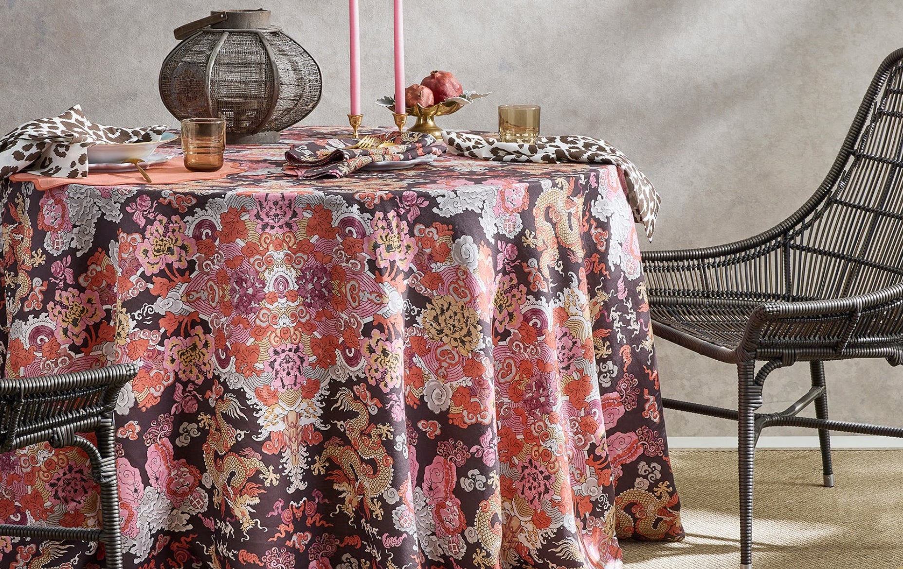 Celebrating the fantastical motifs of ancient myth and legend, Schumacher's Magic Mountain features a psychedelic formation of foo dogs and fire-breathing dragons. Printed in Portugal on our signature table linen, this is a collection designed to make a statement—the perfect backdrop for both special occasions and everyday dining.