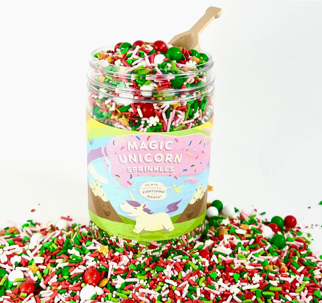 Limited Edition Magic Unicorn Holiday Sprinkles As if sprinkles aren't magical enough! We've taken our signature blend and added some seasonal cheer. Perfect for all your holiday baking, cocktail shaking, cocoa making, and more! This 24oz (that's a pound and a half, y'all) is unequaled in size and is the ultimate compliment to your Cookies, Cakes, Cocktails, Milkshakes, Pancake Batter, Cake-pops and ice cream! 24oz Wooden scoop included Ingredients: Rainbow Jimmies, Jewel Jimmies, Pastel Sequin Wafers, Vanilla Sugar Pearls, Diamond Crystal Sugar Contains Soy, Dairy