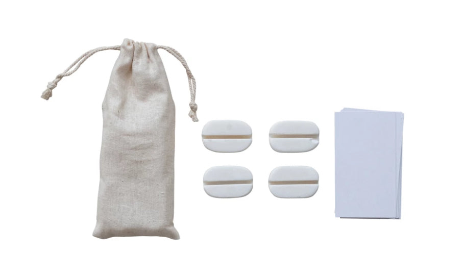 1-3/4"L x 1"H Marble Place Card/Photo Holders w/ 16 Paper Cards, White, Set of 4 in Drawstring Bag