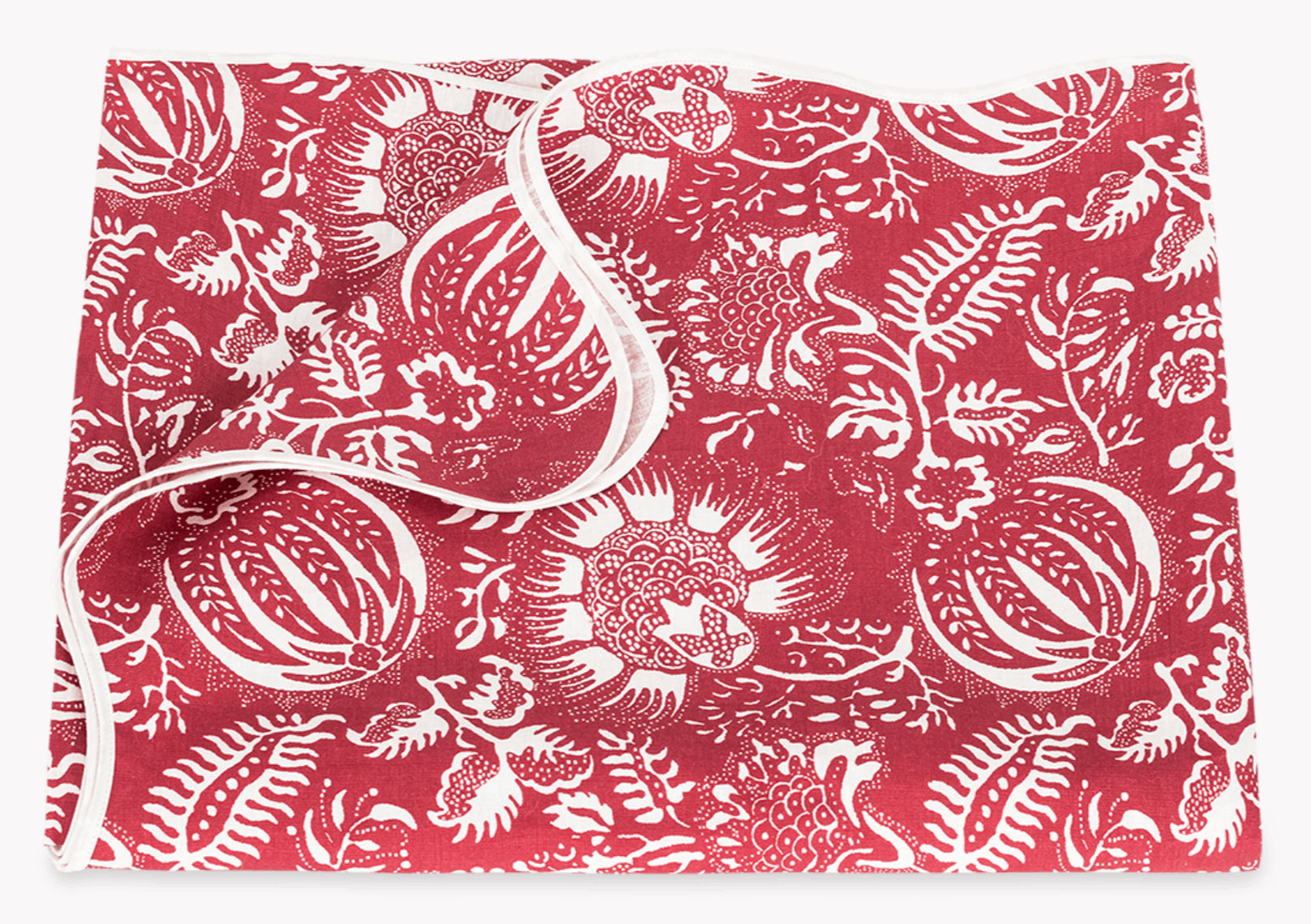 Hand-dyed textiles serve as inspiration for this intricate Schumacher botanical that places the symbolic pomegranate at its center. Perhaps history's most revered fruit, the pomegranate is believed to represent marriage, birth, prosperity, hope and abundance, adding meaning and merriment to these new table linens; finished with our scallop piped edge.