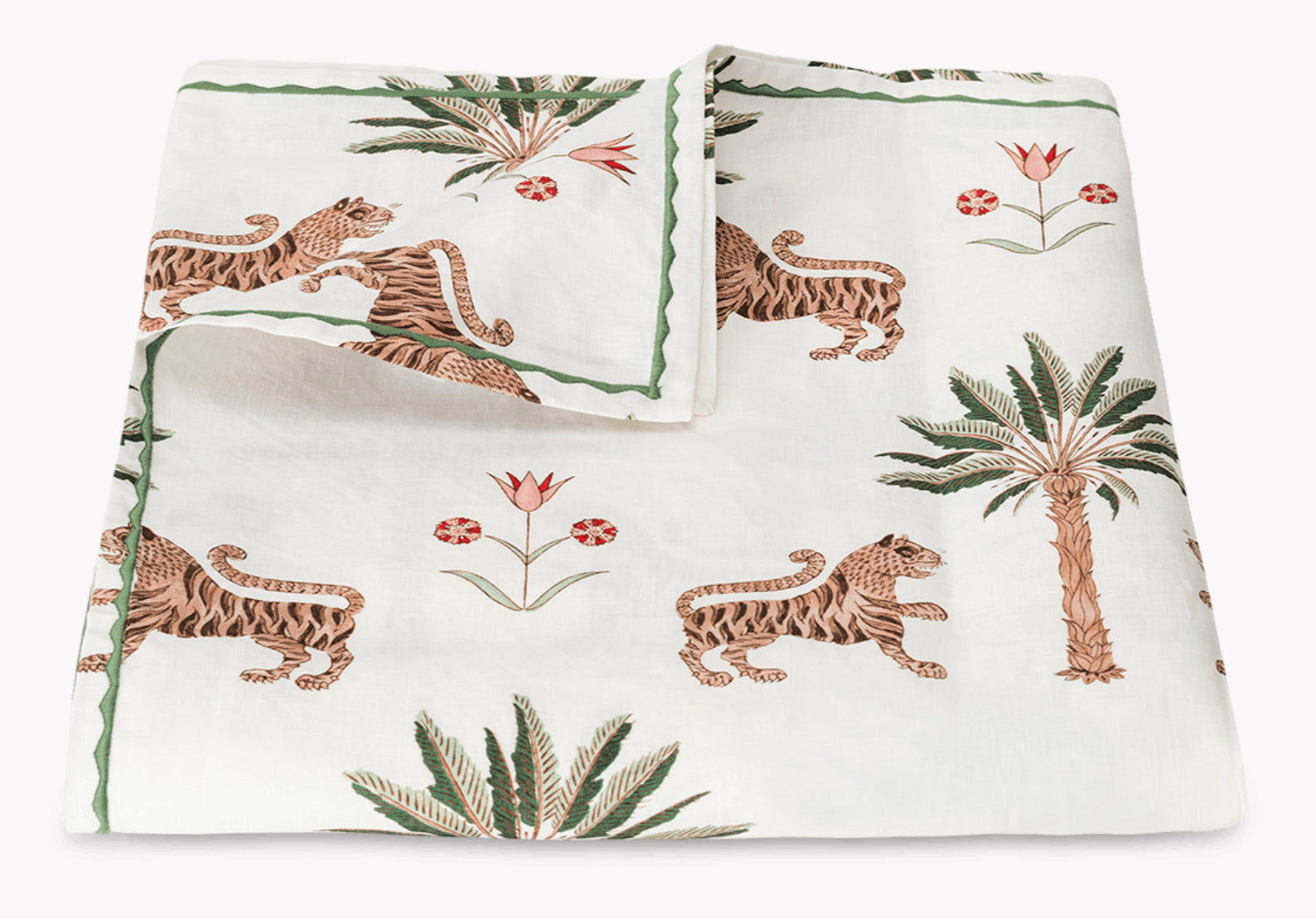 Enchantment abounds in this original Schumacher design informed by antique Eastern block prints rich with bursts of color, iconic jungle motifs and arresting Ottoman florals. The playful scene, printed on soft linen for subtle texture, creates a colorful and festive backdrop for any special gathering around your favorite table.