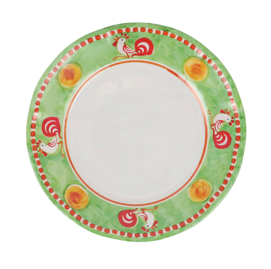 The Melamine Campagna Gallina Dinner Plate features a plucky, handpainted rooster on a soft green background, and its durable material makes it perfect for dining al fresco or with bambinos.