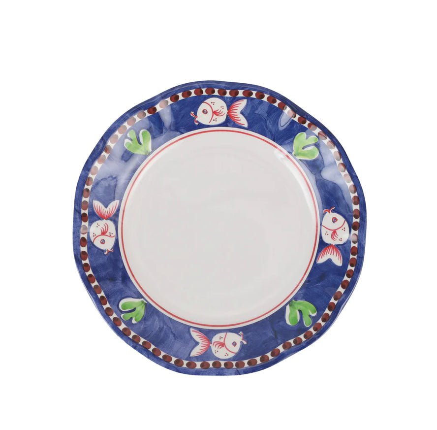 The Melamine Campagna Pesce Salad Plate features happy-looking handpainted fish swimming in a deep blue sea, and its durable material makes it perfect for dining al fresco or with bambinos.