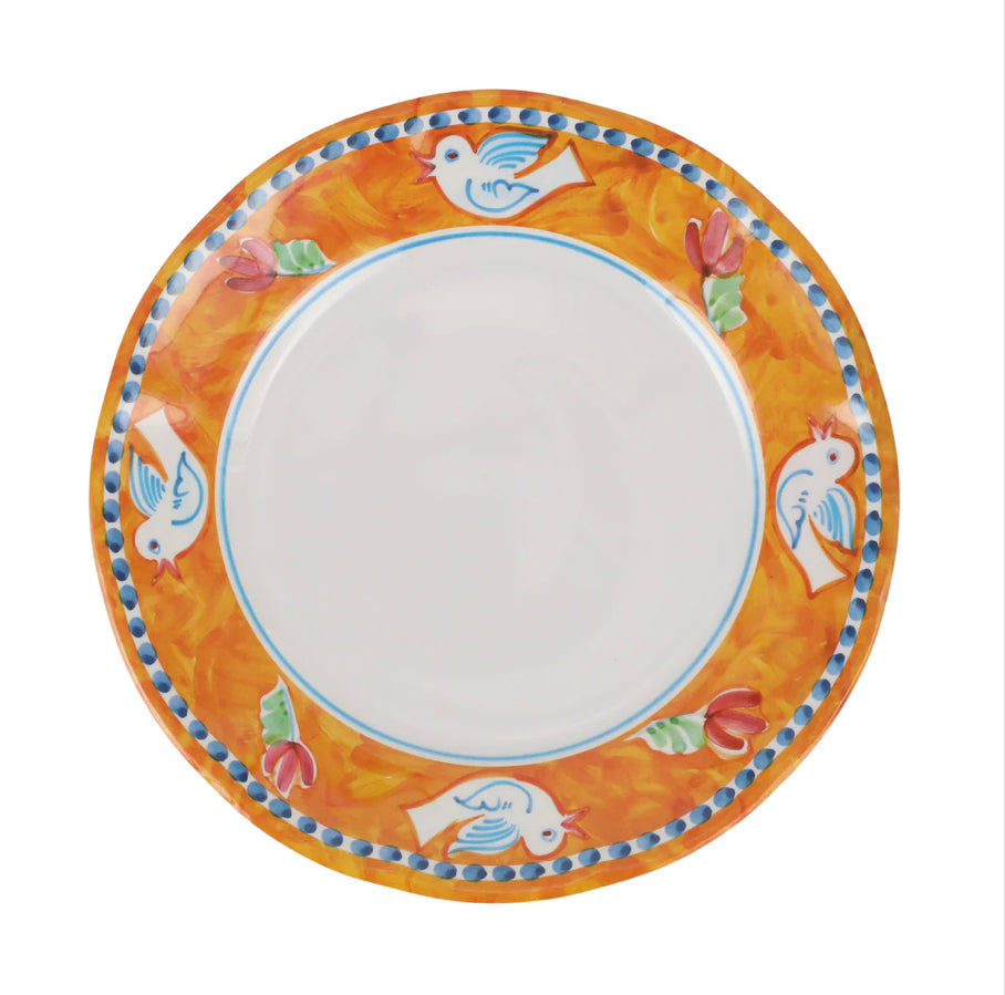 The Melamine Campagna Uccello Dinner Plate features beautiful handpainted birds, and its durable material makes it perfect for dining al fresco or with bambinos.