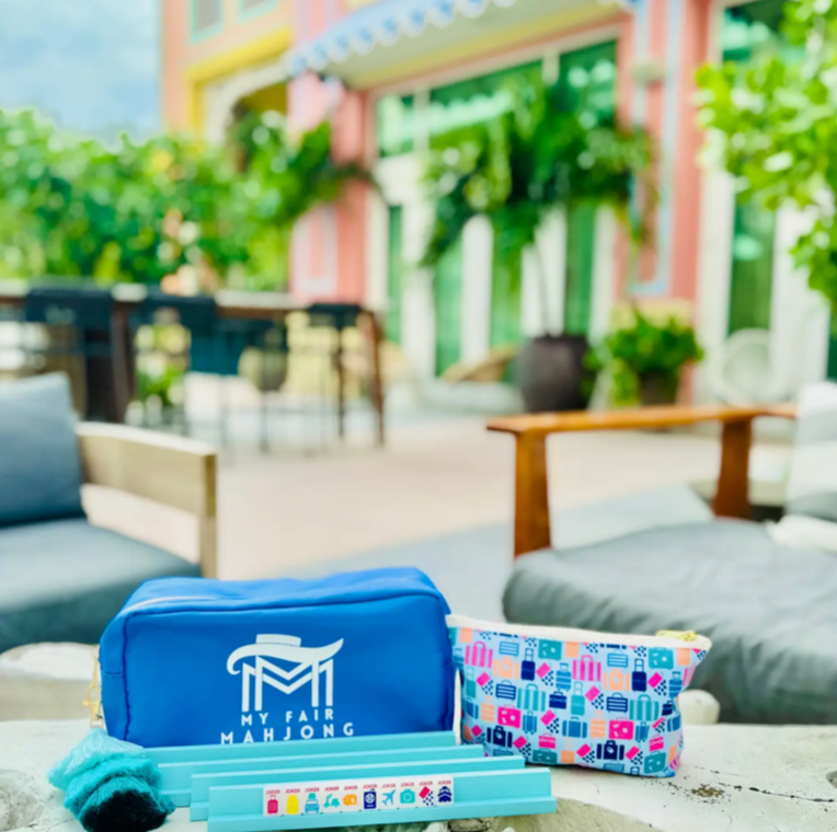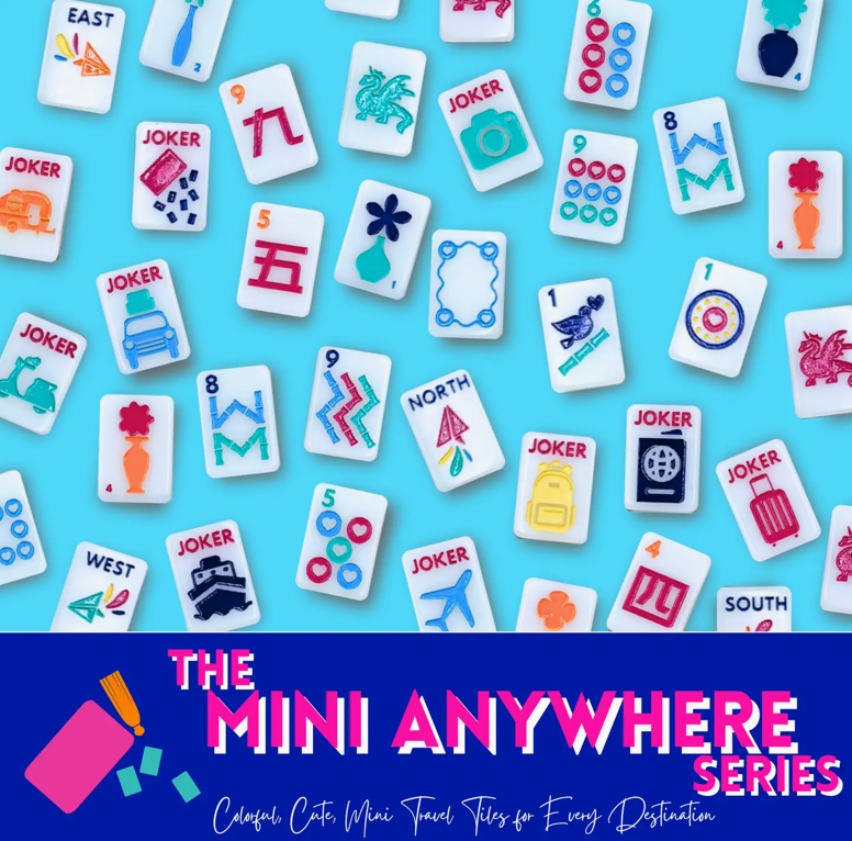 Introducing a delightful and compact Mahjong tile set that brings the joy of the game to your fingertips, with new bold designs and colors. 🀄Package comes in a brightly colored retail friendly box and includes: 1 My Fair Mahjong Cornflower Blue Carrying Bag that holds everything the set comes with, plus a mini mat & NMJL Cards 1 Green Zipper Tassel 1 Small Tile Grab Bag in a fun and colorful luggage pattern 4 Painted Light Blue Mini Racks, 10" in length each 2 colorful dice (14mm) 1 Infographic Quick Start Guide 160 Tiles: 36 Dots, 36 Bams, 36 Cracks, 12 Dragons, 16 Winds, 8 Flowers, 10 Jokers- all in the TRAVEL theme, 6 Blanks. Scalloped-Edge Mini Mahjong Mats are sold separately and are available in several color combintions.