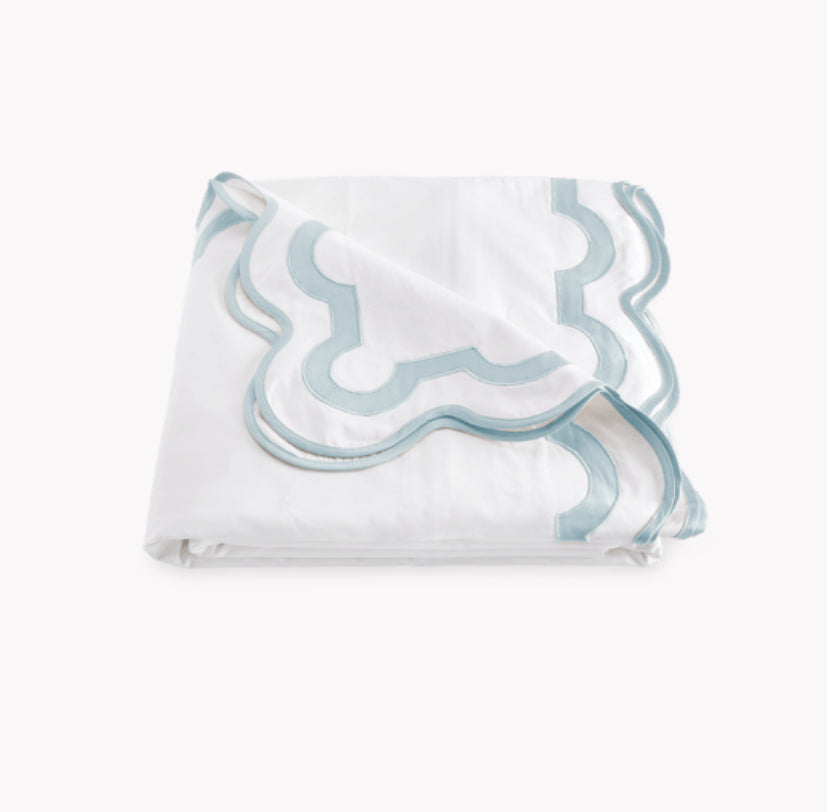 Inspired by a stroll down Worth Avenue in Palm Beach, the unique arch trim of shop awnings becomes a tasteful complement to our soft and luxurious 600 thread count Milano Egyptian cotton percale bedding, made in Italy.