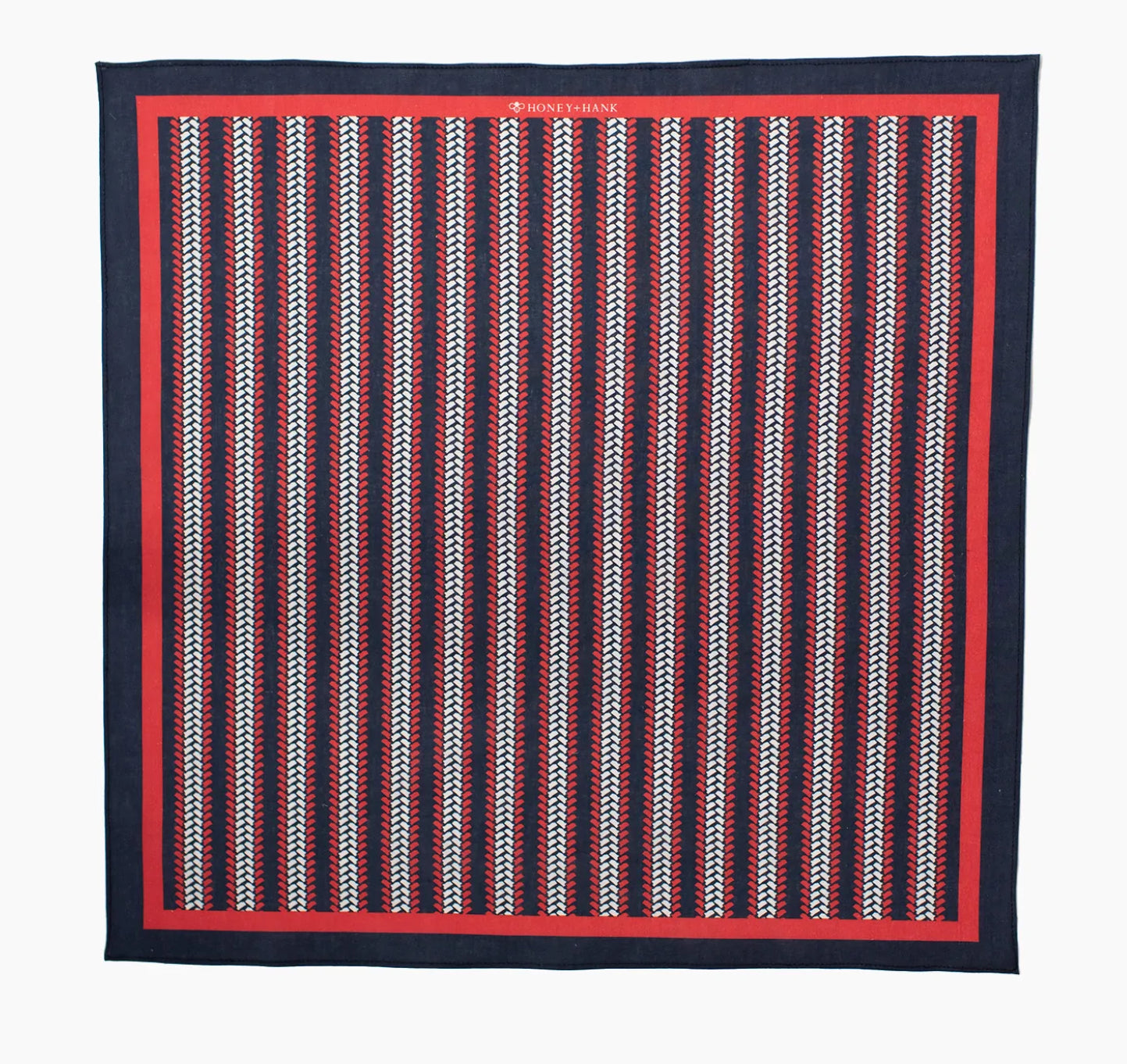 Tied on a bag, in your hair, on your neck, worn as a bracelet or wrapped around a sun hat... you'll never run out of ways to wear your HONEY + HANK college game day bandanas. Can you spot the state of Mississippi hidden throughout the stripes? Make it your own it with custom embroidery to add extra team pride or simply a fun, personal touch (Add 5-10 days for monogramming).