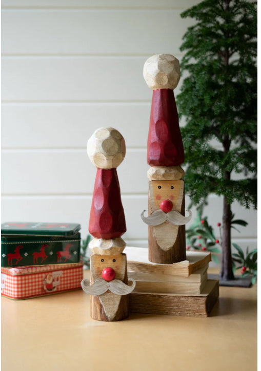Painted wood in two sizes, 17" and 14" tall, this set of Santas suits any holiday arrangement. Group them with other Santa figures or use them to enhance your holiday decor on a corner table.