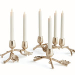 Made from hand-sculpted molds in solid cast aluminum, these nature-inspired branch and leaves taper holders in champagne gold are a substantial accent. Paired with any style taper candles, they make a stunning centerpiece.