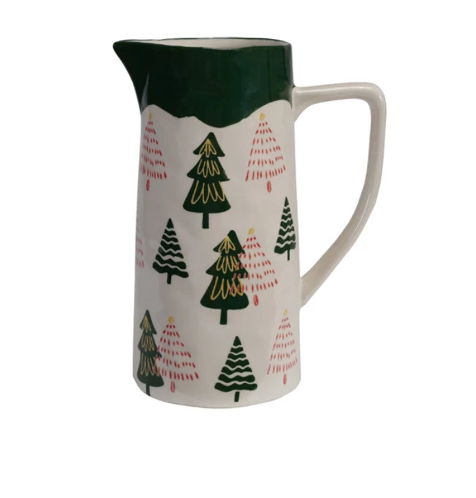 6-3/4"L x 4-1/4"W x 8-1/2"H 48 oz. Hand-Painted Stoneware Pitcher w/ Trees, White, Green & Red