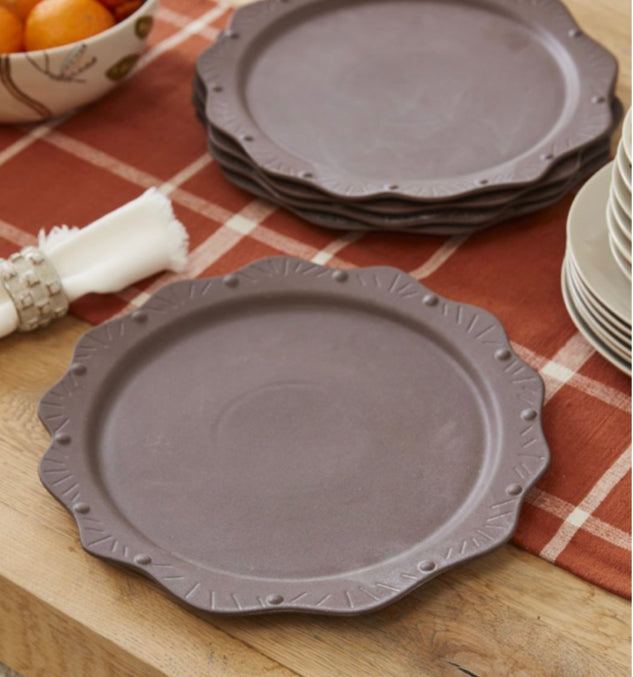 Warm up your tabletops with the natural brown terracotta Plano Charger. A scalloped edge & dimensional detailing creates an understated, artistic look, perfect under any dinner plate. The colors & style of the tabletop Parable dinnerware collection coordinates beautifully with this decorative piece.