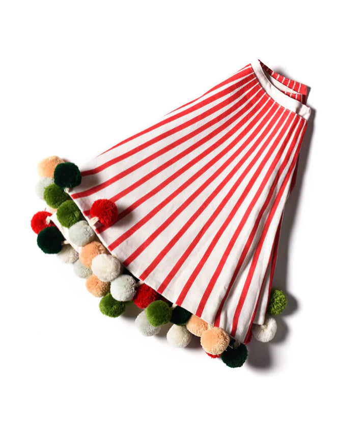 Playful pom-poms at the end of white and red stripes add Christmas cheer to any tree while also providing the perfect backdrop to your Christmas presents. Whether real or artificial, every tree needs this beautiful Red Stripe Tree Skirt with Pom Poms.